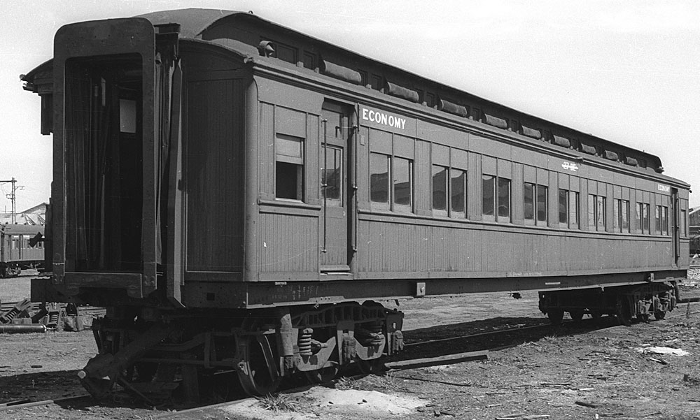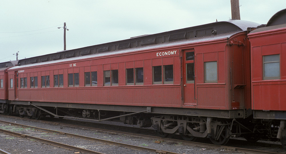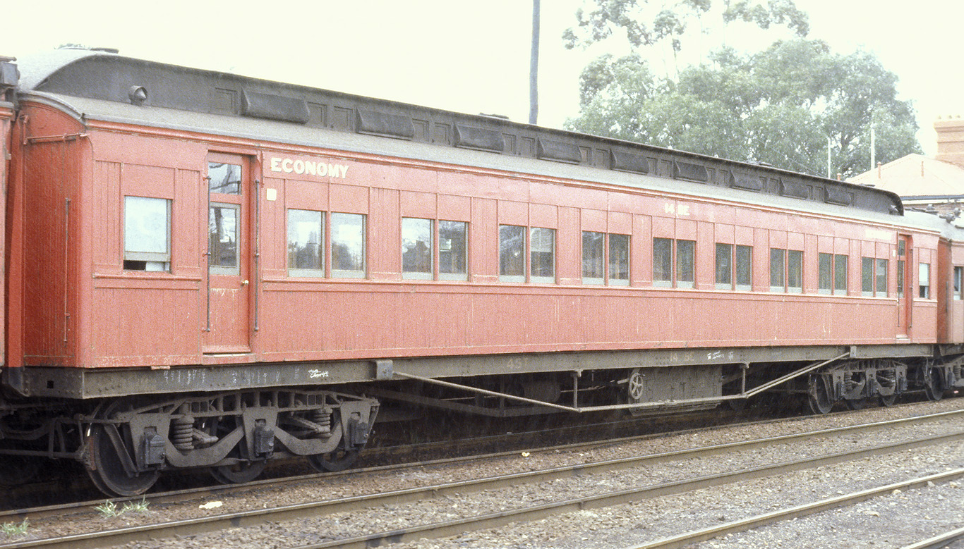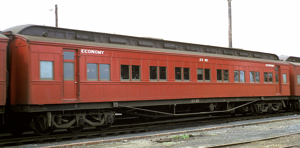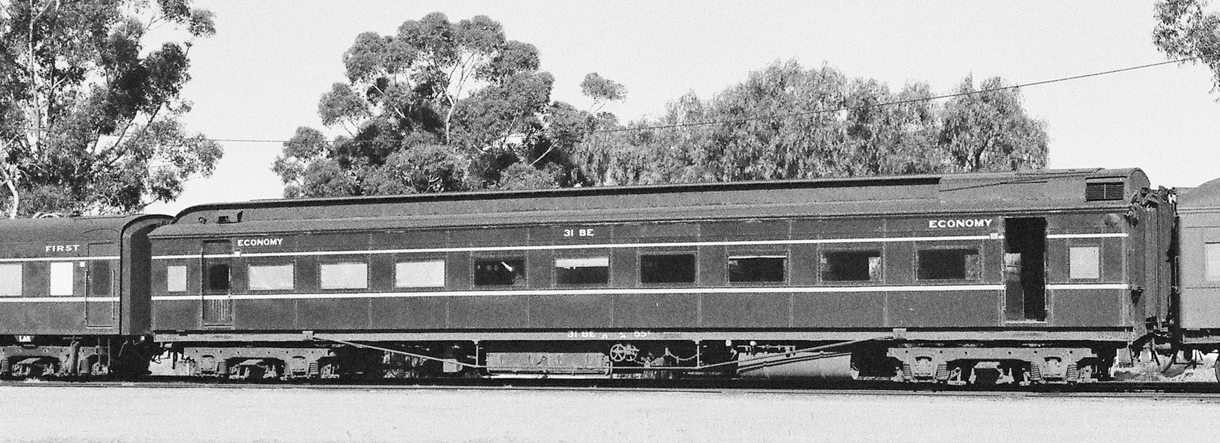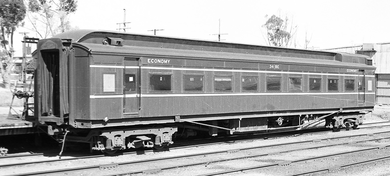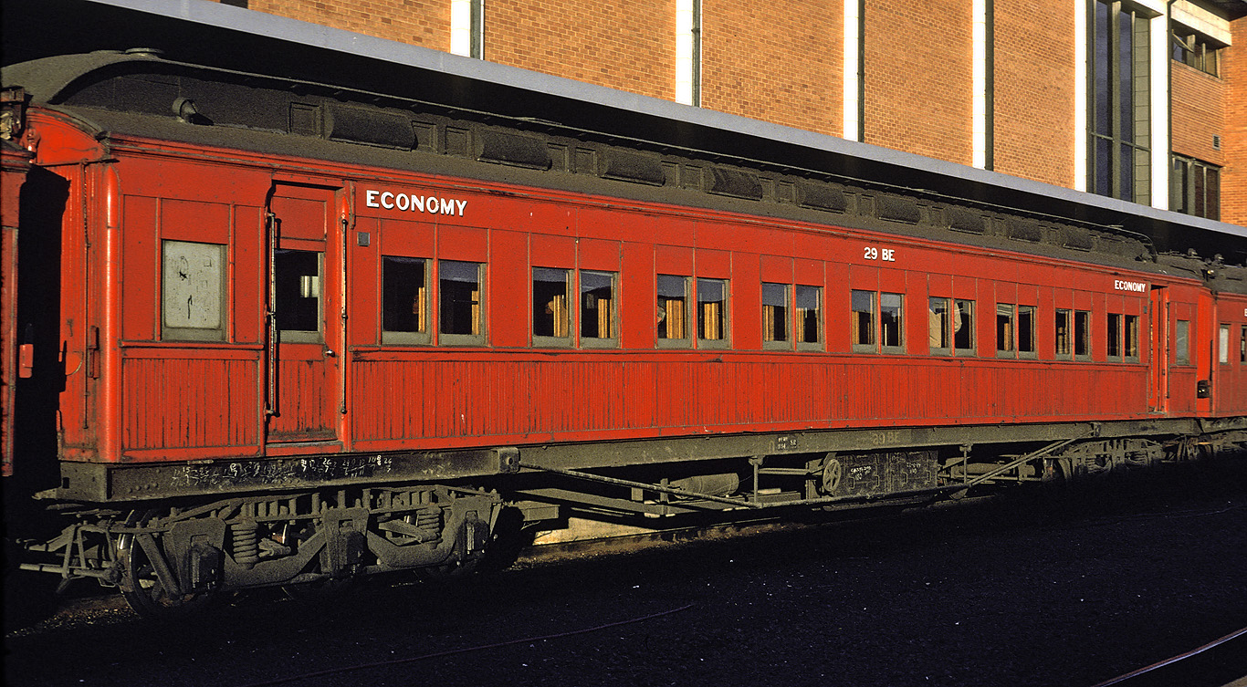 ABOVE: BE 1 at Wangaratta Sept 15 1969. The 63 year old car is so freshly painted that the smell of the new paint probably filled the air. In April 1970 the term "second class" was replaced with "economy class" which means this would probably be one of the last cars to be painted "second class", (photo courtesy Neville Gee)