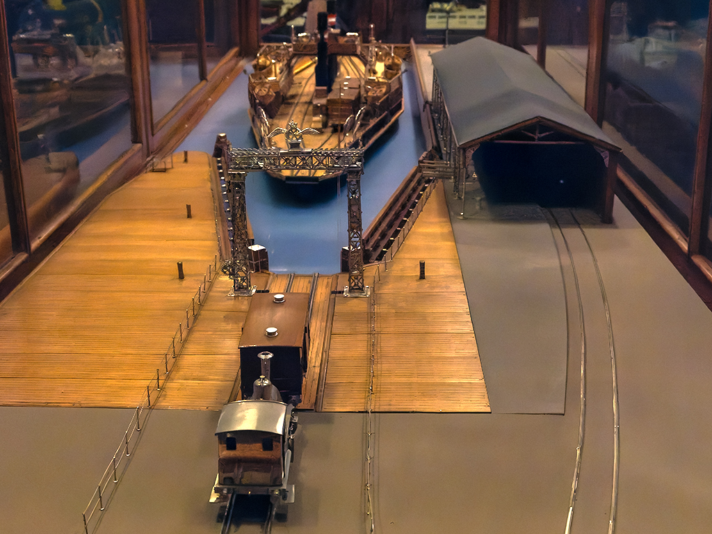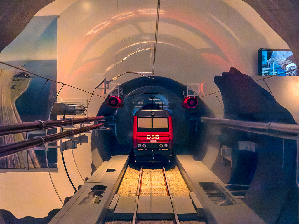 ABOVE: On my first visit to Denmark in 1983 my train had to be put on a ship half way across the country as Denmark is actually a group of islands. ABOVE: This model shows the general idea of how the tracks on the land connect to the ship. In the late 1980's Denmark built a tunnel and bridge to link the two islands and we travelled over that today. BELOW, a model of a cross section of the new tunnel.
