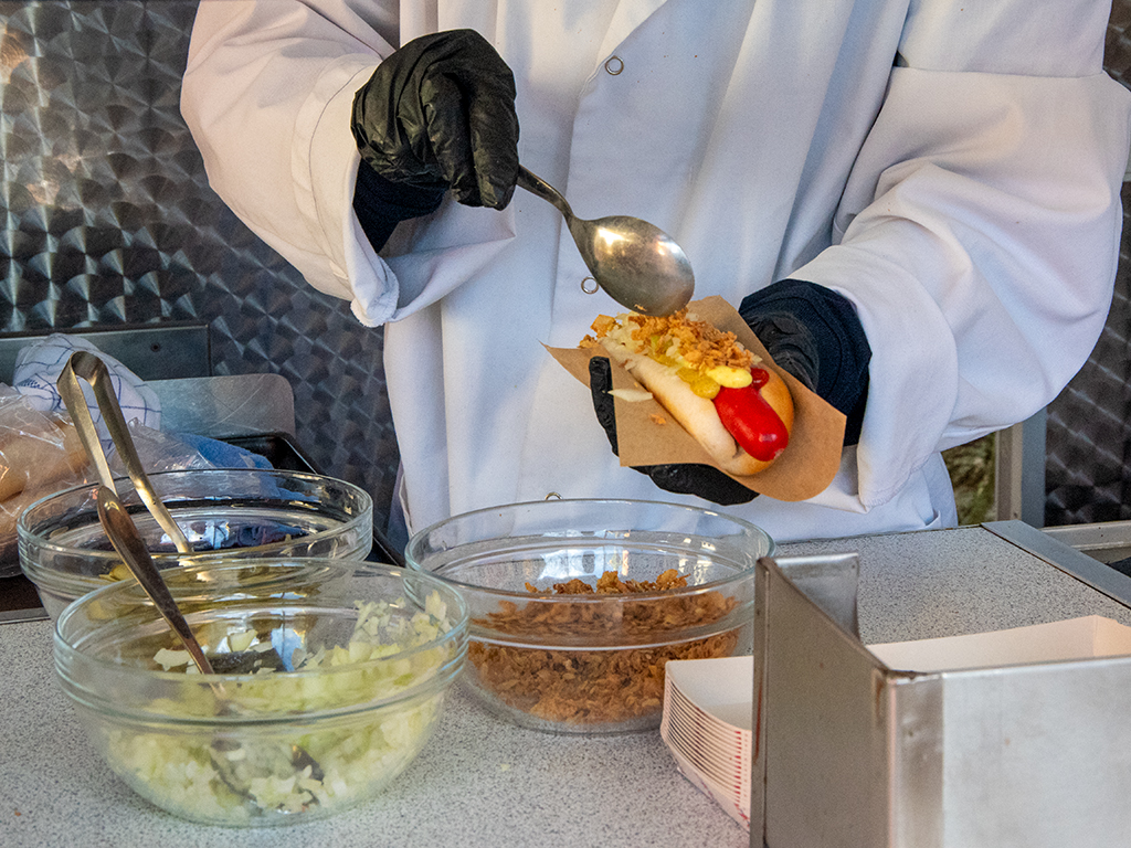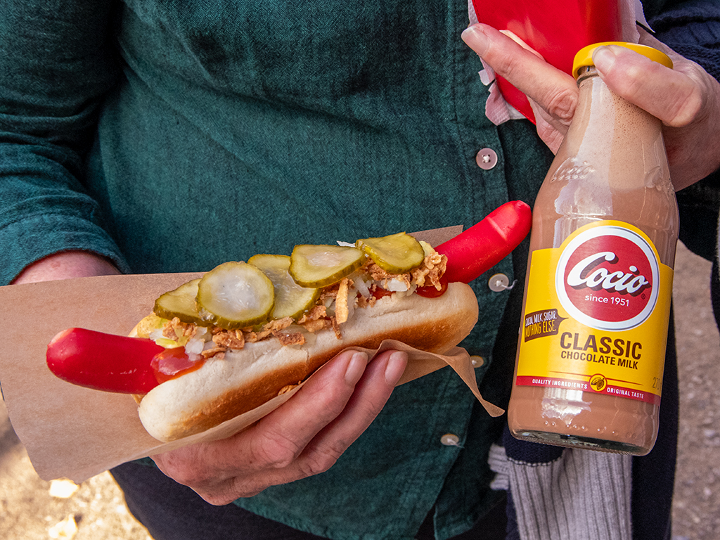 ABOVE & BELOW: For lunch we had a traditional Danish hotdog, the sausage must be the bright red variety and it comes with tomato sauce and mustard as well as raw and fried onions and pickled cucumber. The chocolate milk is a mandatory accompaniment ! It was yummo!