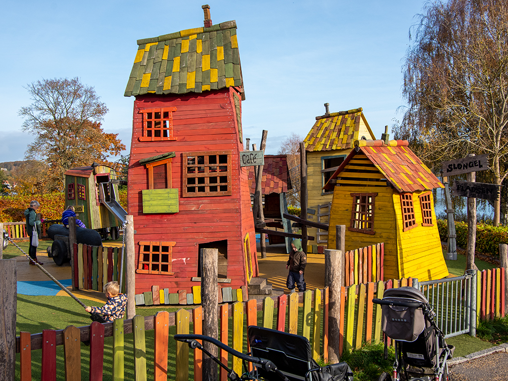ABOVE: By the lake we came across this playground that contained things from the books by Skandeborg's famous author Ole Lun Kirkegaard. Replicas of things he'd drawn in his books.