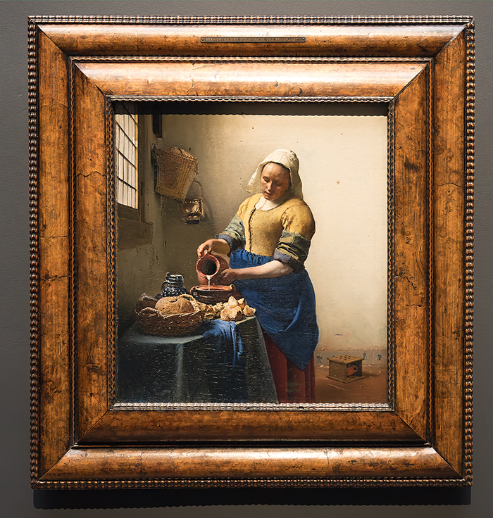 ABOVE: Vermeer's most famous painting "The Milkmaid" circa 1658. Most painting at this time was of aristocrats, so this painting, of a servant doing her everyday job was a departure. It is a beautiful, quiet painting. Not heroic like some many of the paintings at this time. The lighting is sublime. A simple job being made a thing of beauty.