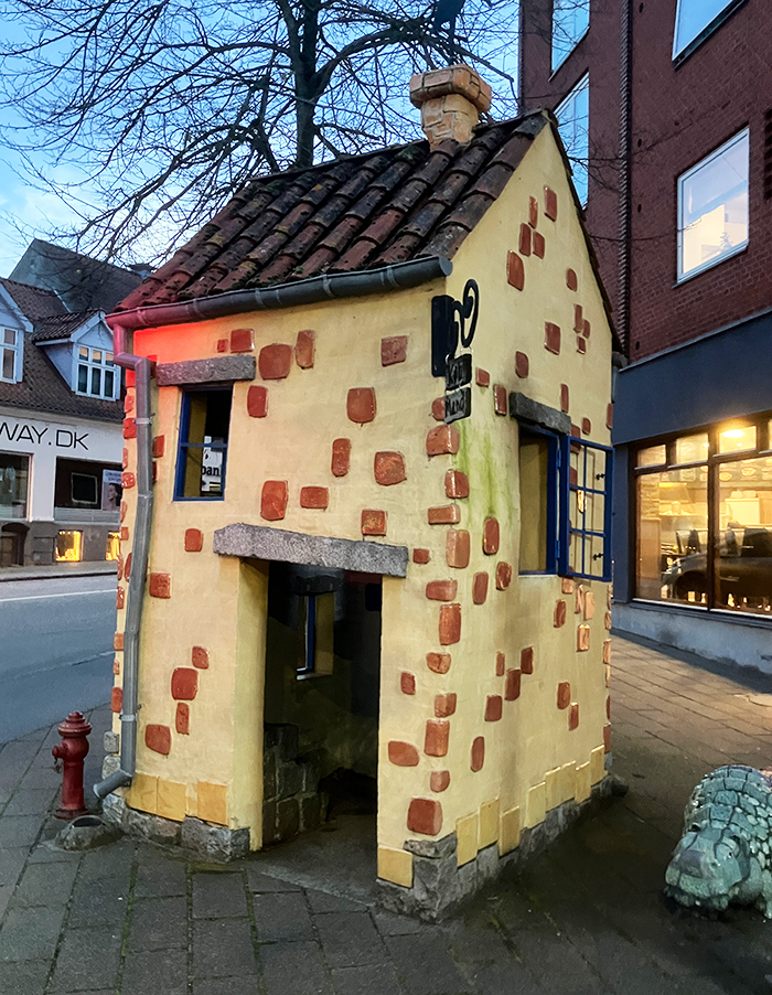 ABOVE: Skanderborg is home to a much loved Danish childrens book author, Ole Lun Kirkegaard. The city has erected things out of his books around the town and this is a crazy little house on main street.