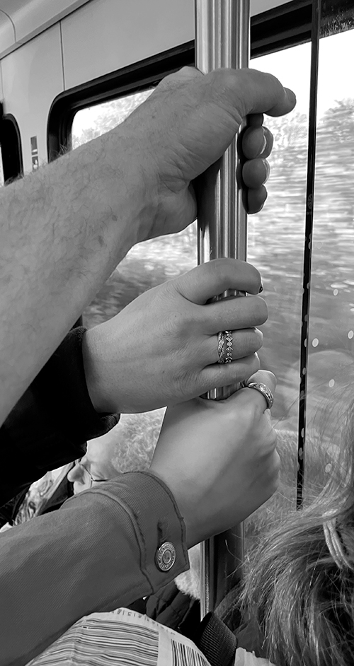 ABOVE: On the packed train from Amsterdam to Dusseldorf, a collection of passengers hands, hanging on.