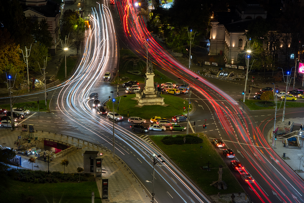 ABOVE: This is the view from our 17th floor balcony at the Grand Hotel Bucharest. I haven't used the tripod much on this trip so I got it out to get this of the big roundabout near us.