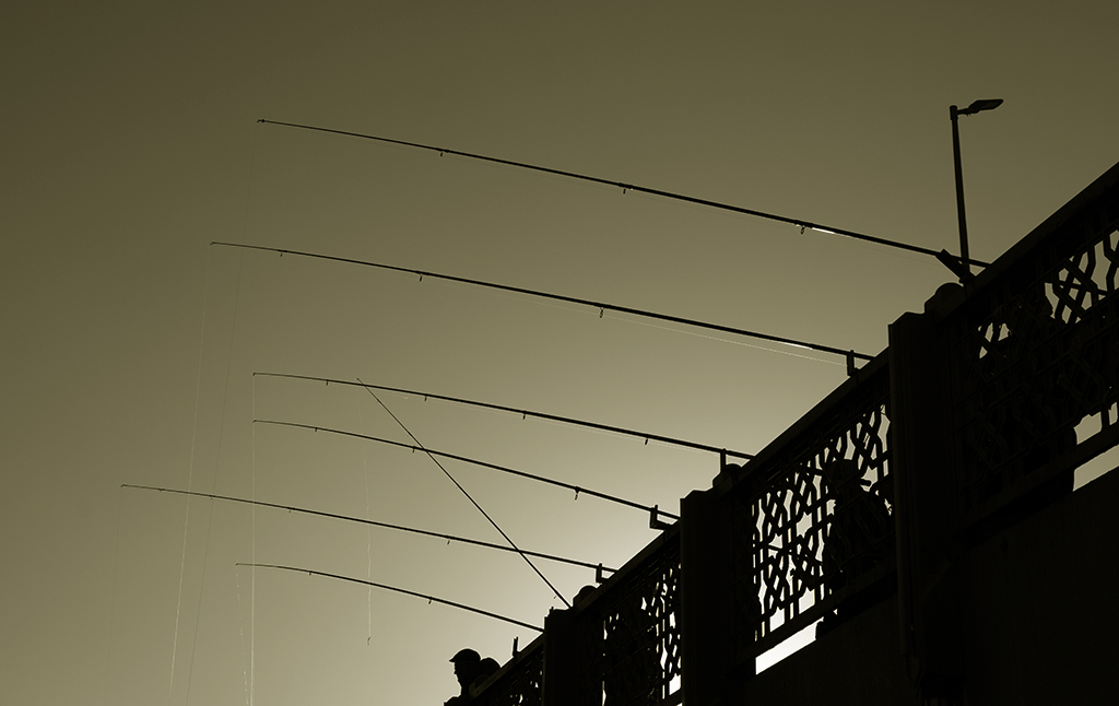 ABOVE: After we got back to shore we walked over this bridge where there were hundreds of fisher people hanging their rods over the bridge. I thought this was an ingenius use of space, builing retail areas under the bridge over the water. BELOW: a view from below of the fishing poles.