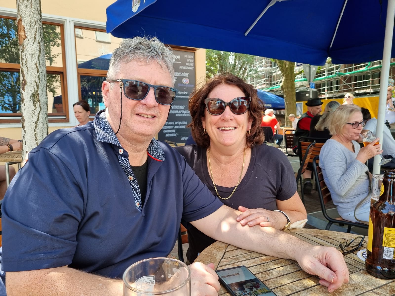 We got to Freiberg on a blisteringly hot Saturday afternoon and the town was really hopping. We found a really nice place to have lunch and here is a photo of Damian and Louise waiting for their meal.