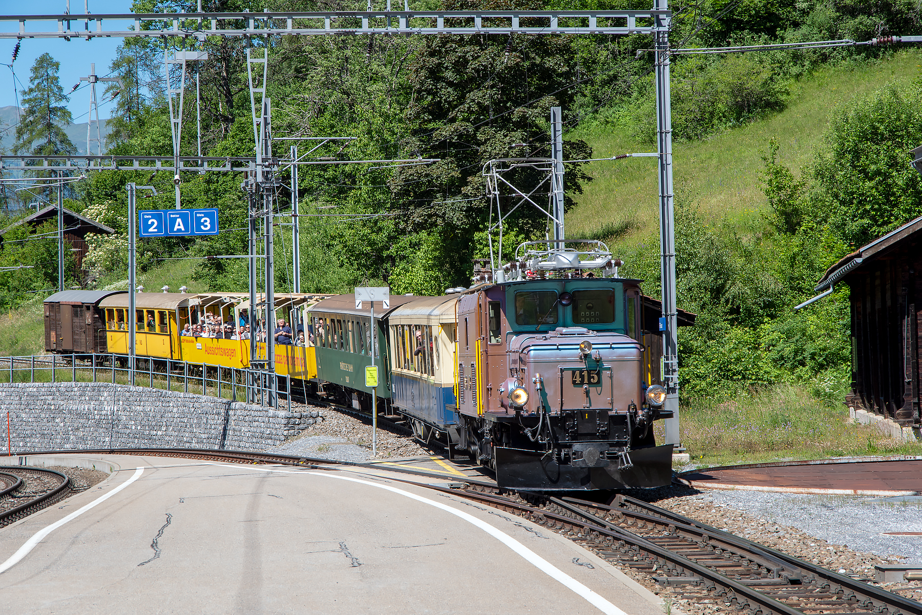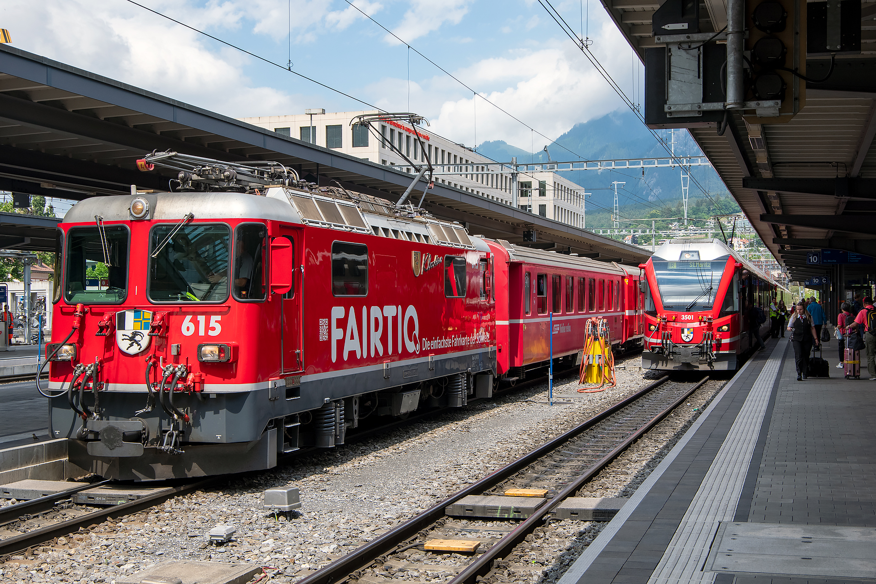 BELOW: Whilst waiting for our train from Filisur to St Moritz this ancient historical tourist train arrived from Davos. The loco was built by Brown Broveri in 1923. This is the Davos branchline coming into Filisur.