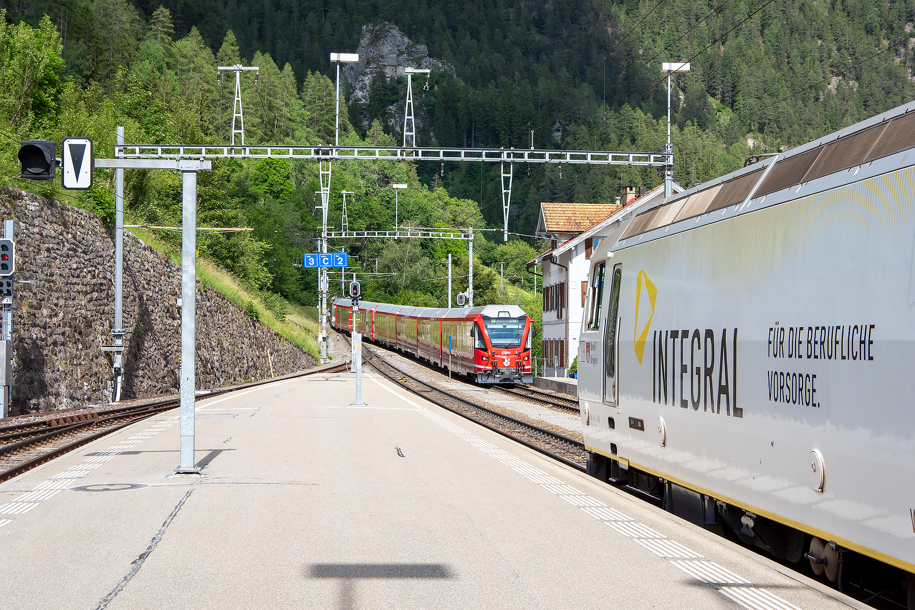 ABOVE: I can't recall the name of this station but our train is crossing a train going to St Moritz.