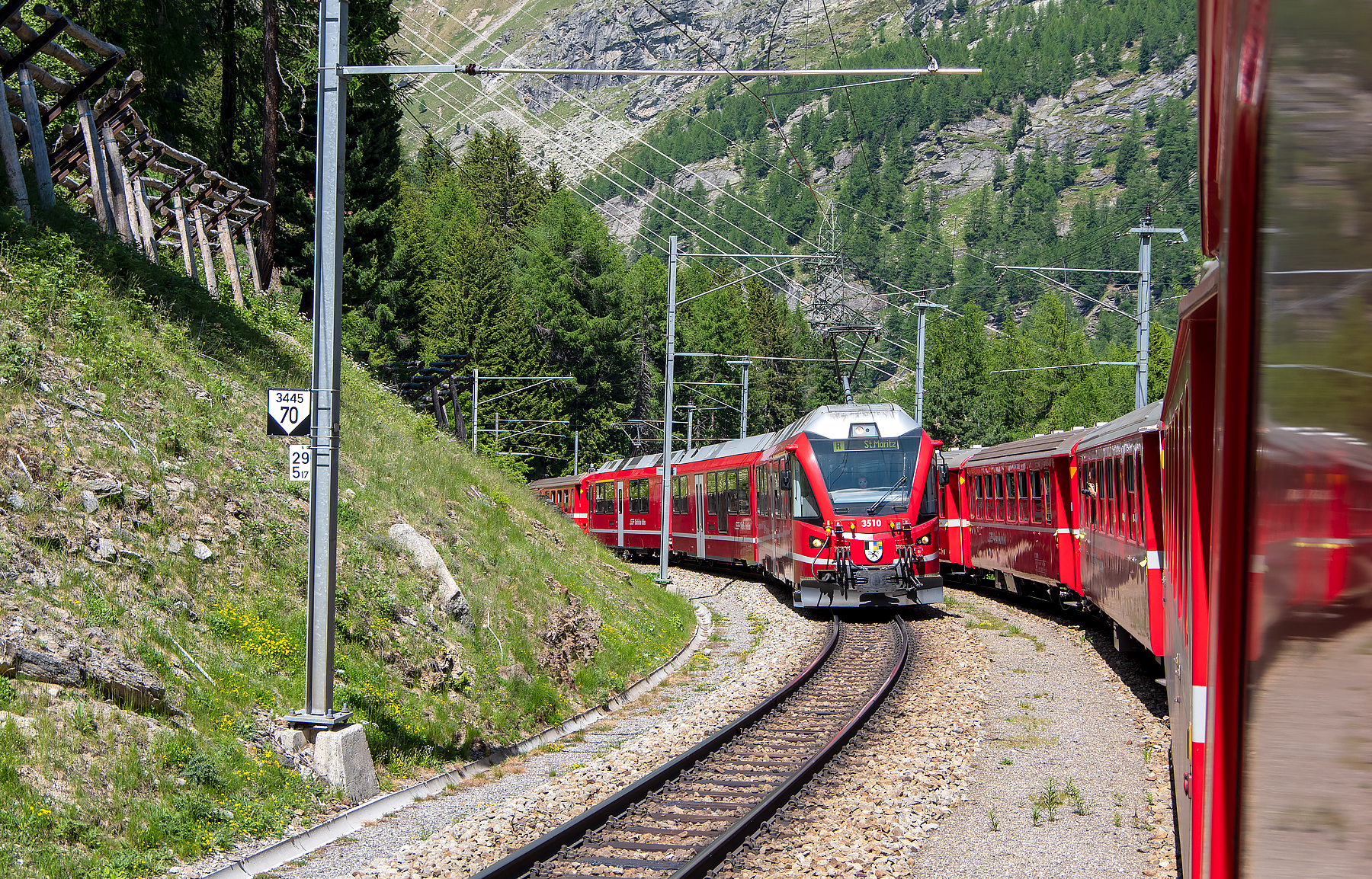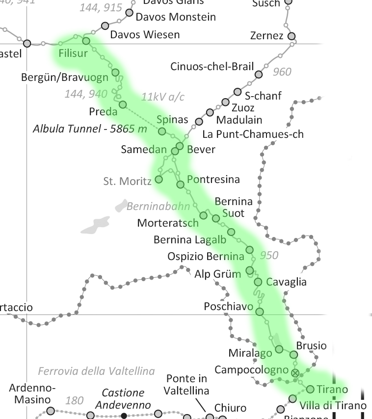 BELOW: the days travel was from Filisur to St Moritz and then St Moritz to Tirano. The line is truly a railway engineering marvel. The highlights of the trip are a spiral tunnel where the line goes over itself inside a tunnel and a viaduct where the train does a complete 360 degrees. I wish I was a fly on the wall when the surveyors presented their route to the railway that wanted to build the line. "We want to build a tunnel that goes in a complete circle" "We propose a viaduct that goes over itself in a 360 degrees circle" the owners first question must have been "And how many bottles of wine had you had when you came up with this?"