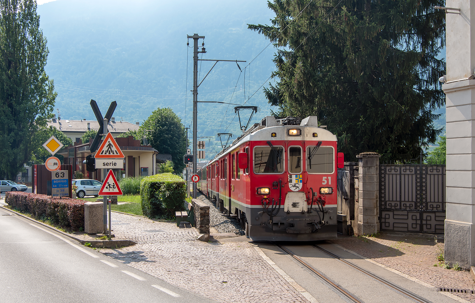 ABOVE: Whilst at the church a Tirano to St Moritz train was departing Tirano. BELOW: A St Moritz to Tirano train passes the church and is about to arrive at Tirano. The Swiss border is less than a kilometre behind the train.