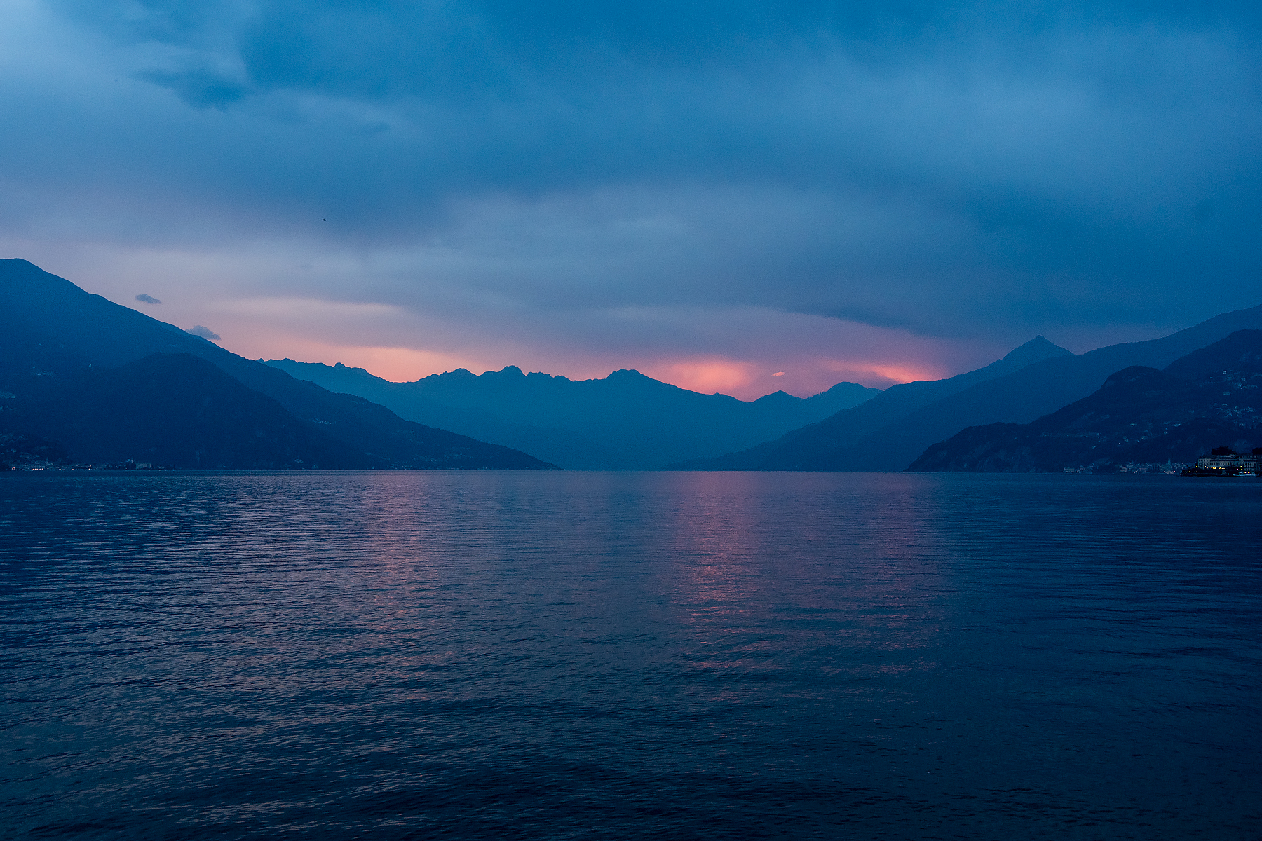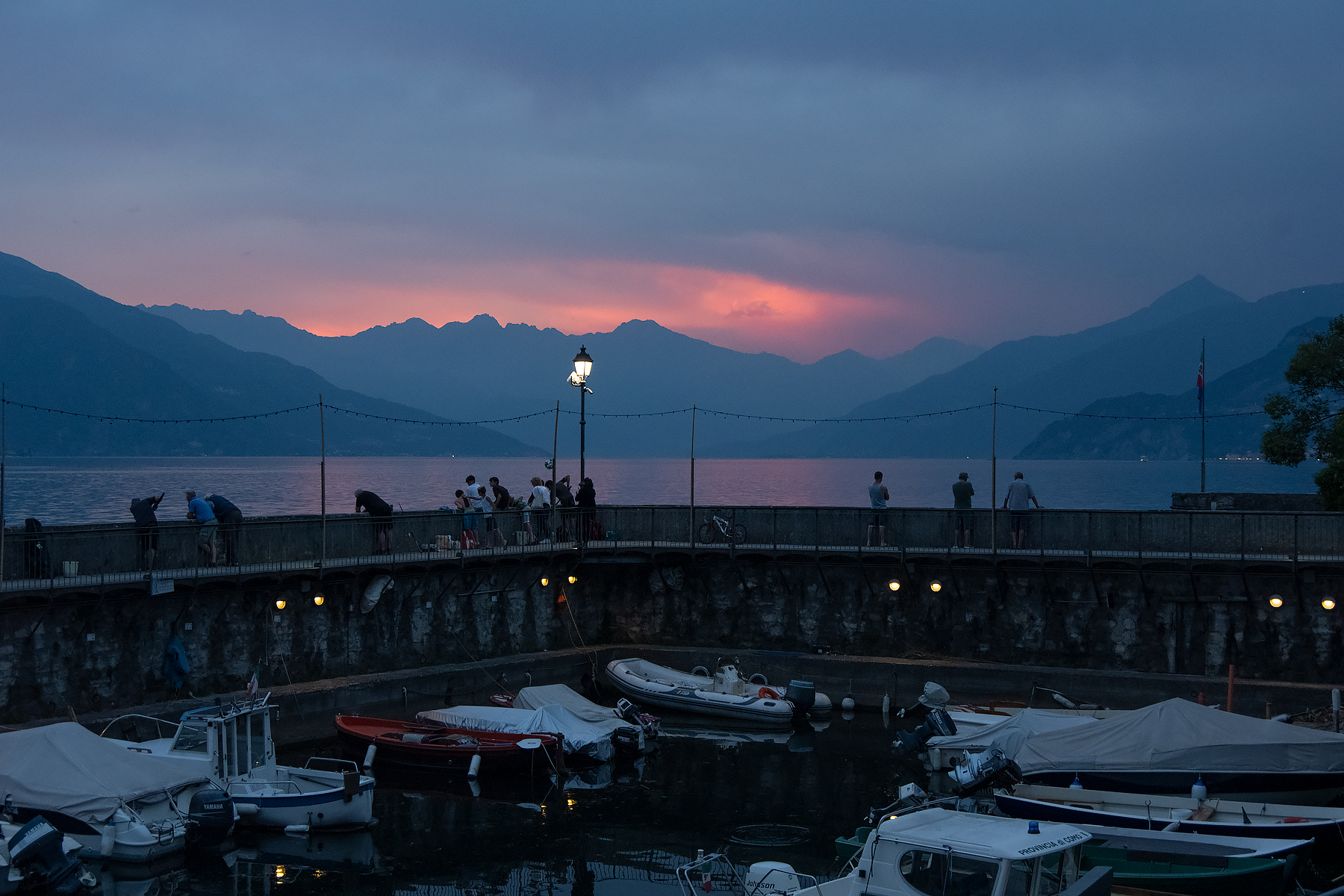 ABOVE: The view from our balcony.There was a highly rated trattoria near to our place that didn't open until 7.00pm. We got there at 9.03pm and were told the kitchen had closed! A fitting end to our day. We came back to our place and snacked on salami, mortadella, olives and cheese that we had bought at at supermarket nearby. The photo BELOW is of the sunset over Lake Como.
