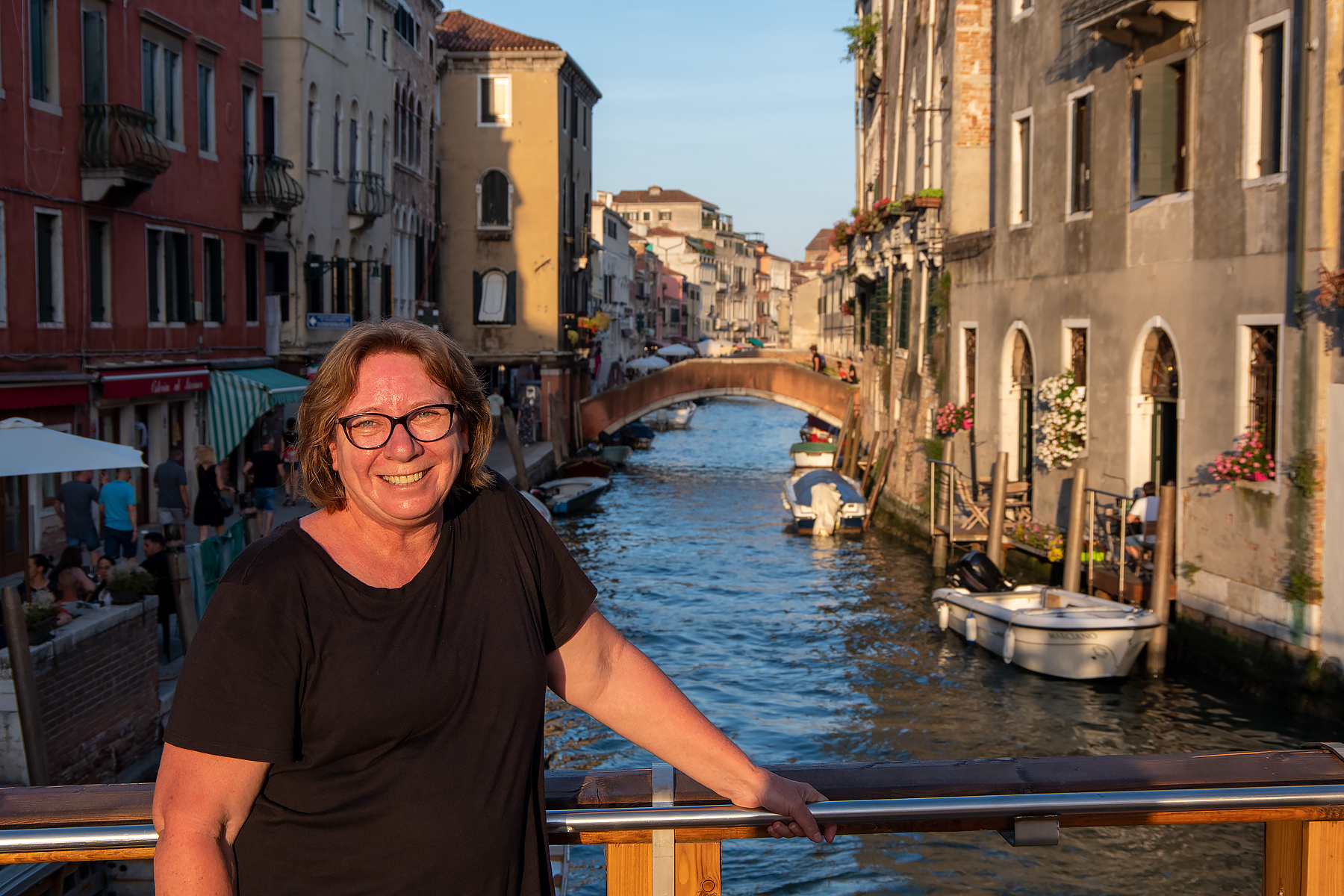 ABOVE: Kris was initially a bit hesitant about visiting Venice, she thought it might be a bit too touristy, it is, and was a bit worried about being in a place that is sinking, it is. Louise booked our accomodation and it is in one of the less touristy areas. We even have a view of a canal. Kris looks pretty happy to be in Venice!