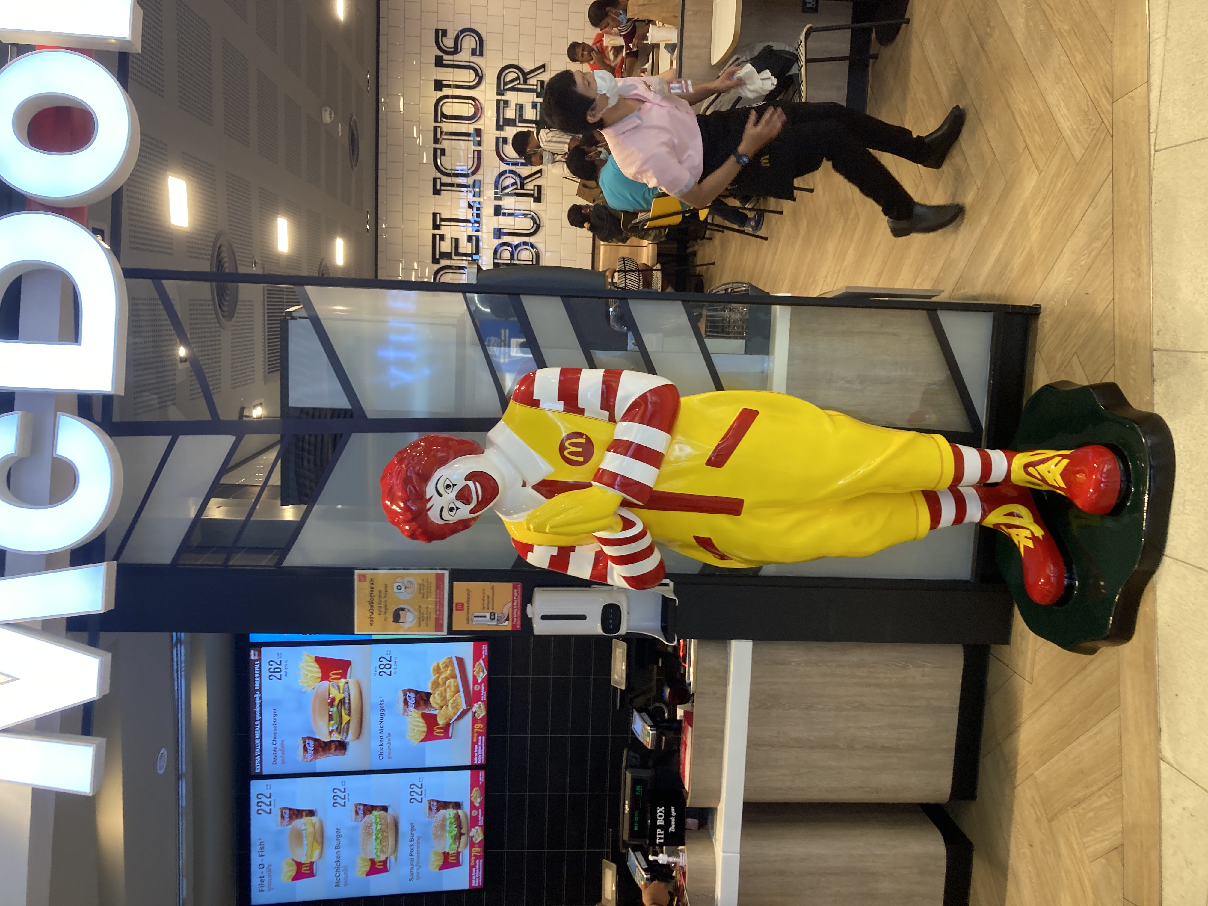 Our good friend and next door neighbor Dom graciously drove us to the airport at the ungodly hour of 6:45am The gory details of an international flight have never been turned into a novel or a movie, not even a Netflix drama. That's because international flights basically suck, like prostate exams they are something to be endured, knowing that ones life will get better very soon. The flight from Tulla to Bangkok was uneventful and due to a booking oversight we had 7 hours to fill in at the Bangkok airport. We had left Melbourne in 7 degrees and the temp in Bangkok was about 30C. That airport would have to win a prize for being one of the worst international airports. There was a McDonalds which had a statue of Ronald McDonald in a very Thailandish pose BELOW: