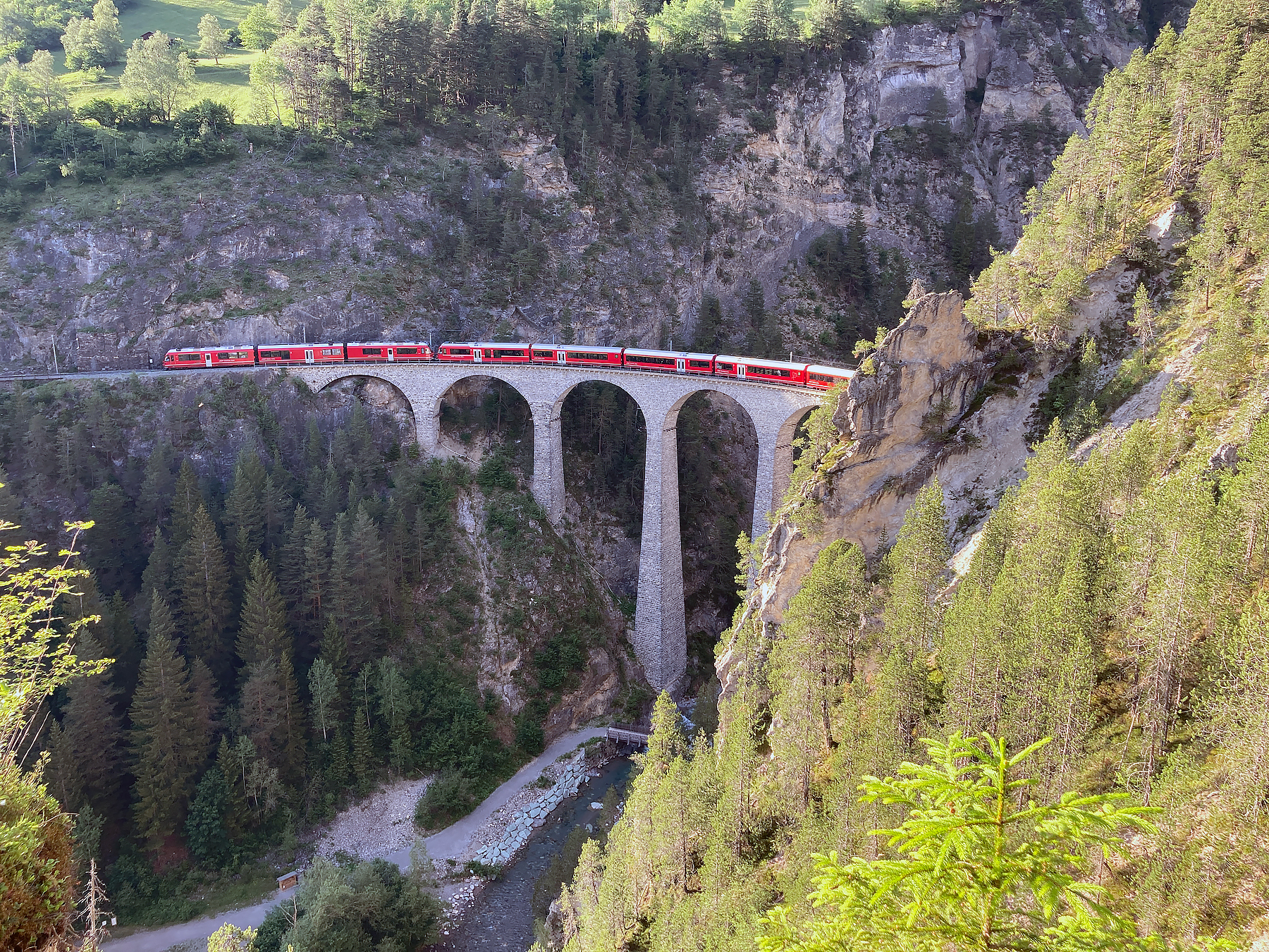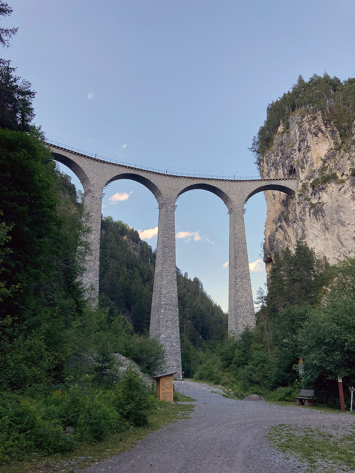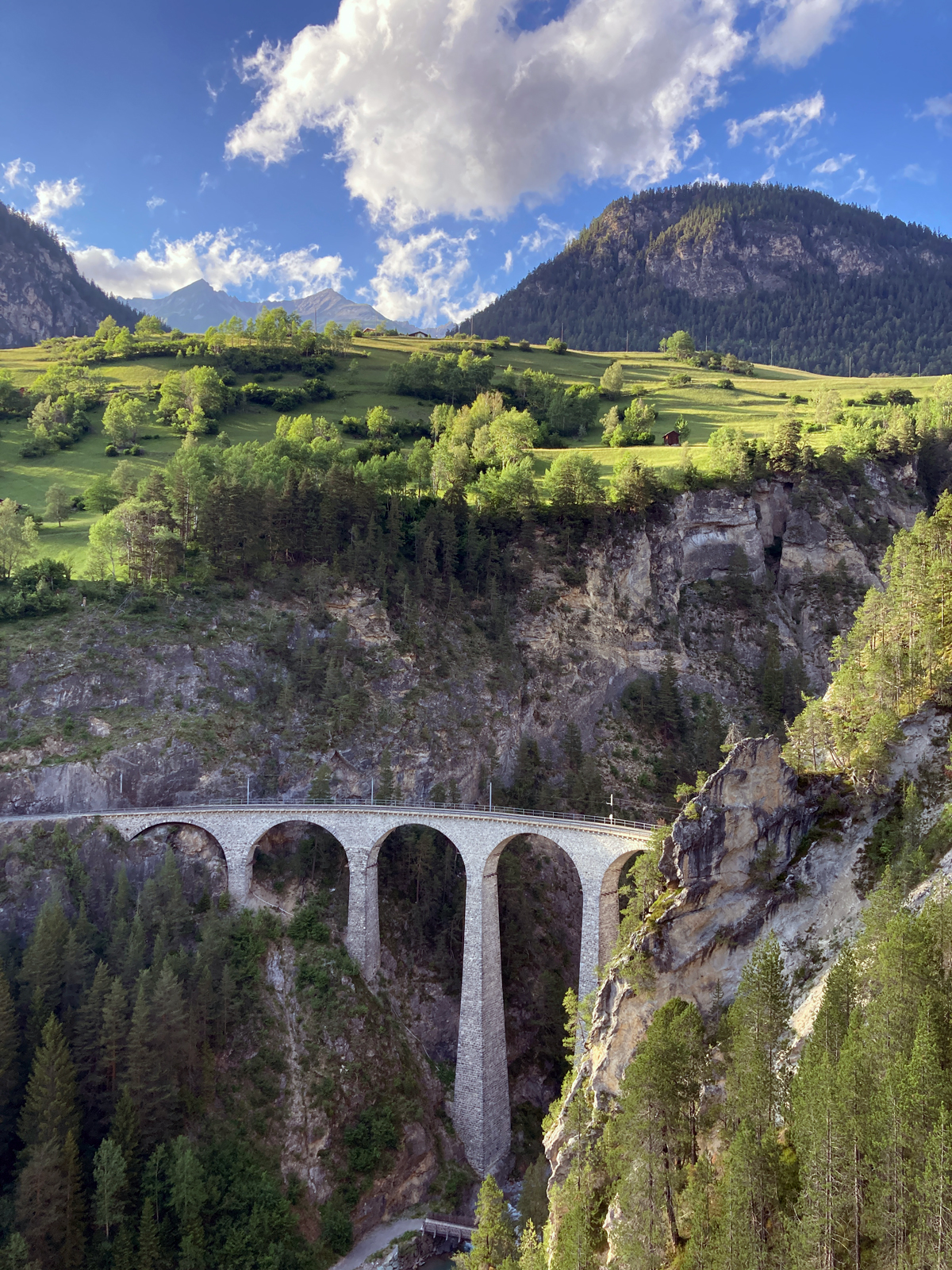 Filisur is famous, in train geek circles, for its amazing curved stone viaduct that was built in 1910ish. It is not only unbelievably high, and curved but it goes straight into a curved tunnel. Damian and I hiked to it which was a real physical effort but it was worth it. To stand underneath it is awe inspiring! BELOW are some photos of it.