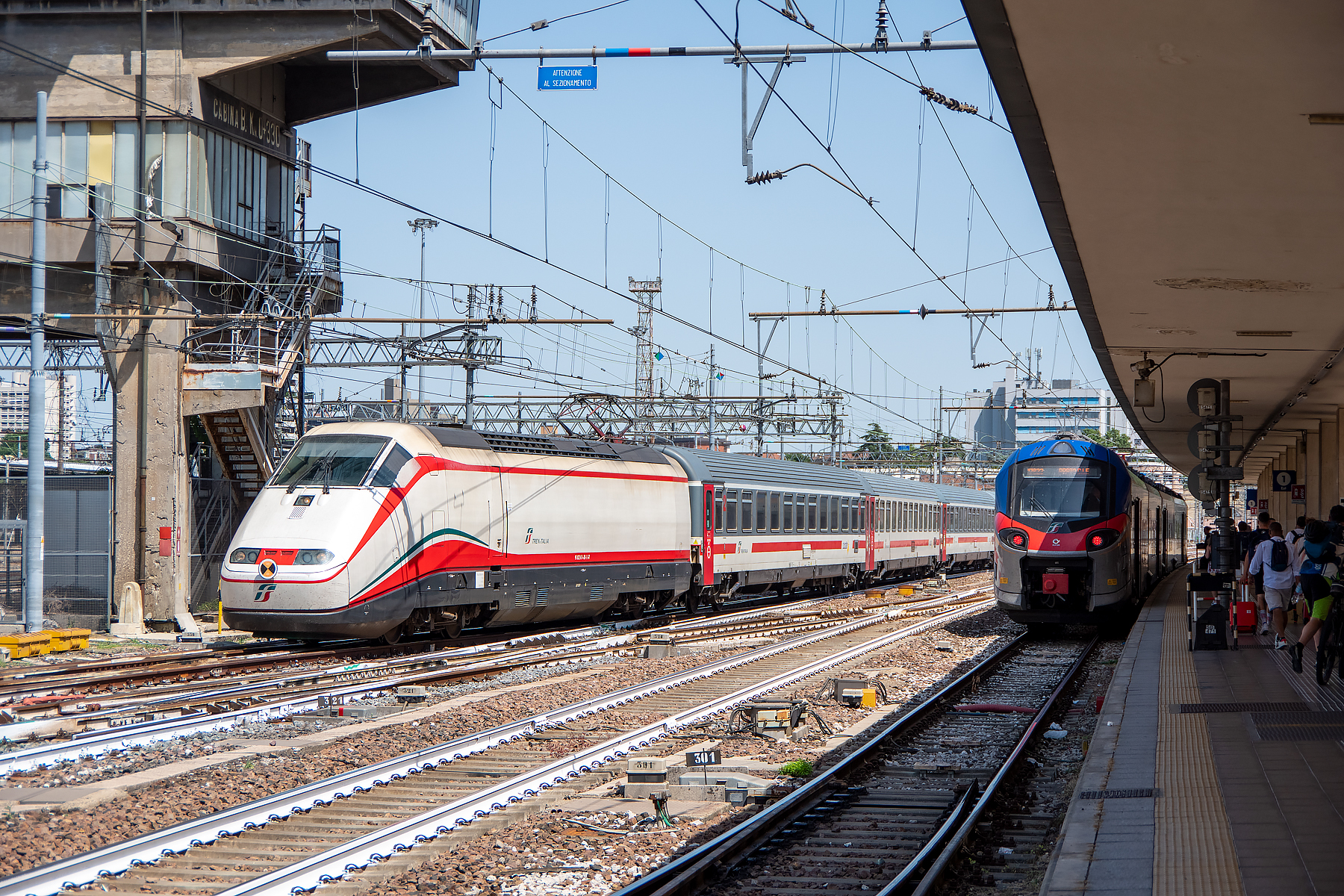 ABOVE: A high speed intercity Trenitalia train arriving Bologna at the east end of the station. Our train from Bologna to Prato is on the right.