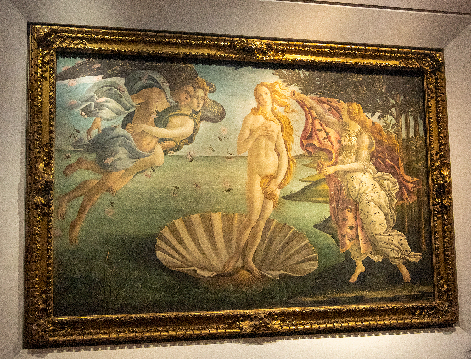 ABOVE: Without doubt, the most famous painting at the Ufizzi is The Birth Of Venus by Botticelli. This painting was rather obscure outside art circles until it was used relentlesly and mercilessly in the production of Monty Python's Flying Circus. It depicts the goddess Venus arriving at the shore after her birth, when she had emerged from the sea fully-grown. No doubt a few bottles of vino were downed to come up with this idea!