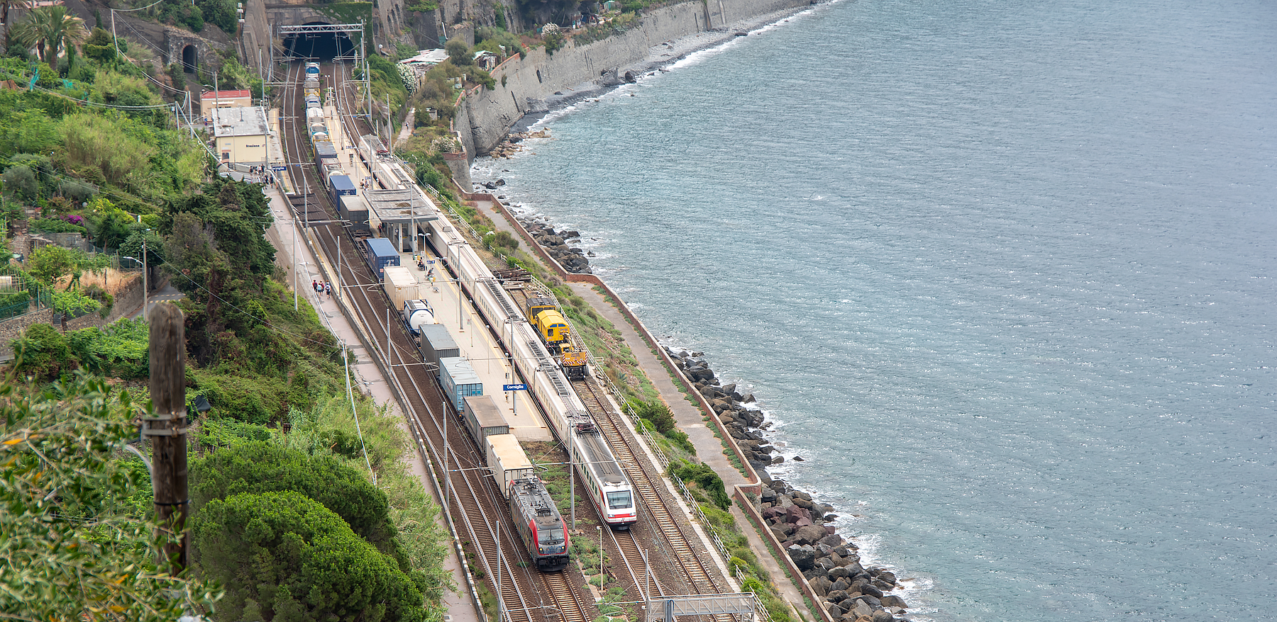 Today was the first day of our 3 day stay in Cinque Terra. 5 seacliff villages that can only be reached by train or by hiking. Some of the trails between the villages are always closed because of the ever present landslides. We had to catch the train from the town where we are staying, Manarolla, to Corgnlia. We have been to Corniglia before and well remember the staircase from the station to the town. It is a switchback of stairs that takes at least 20 minutes to summount. Incredibly hard work in the high temps and humidity. The photo below was taken from abot 3/4 of the way up the staricase, looking down the station where our climb began, it shows a northbound goods train being overtaken by a northbound intercity express.