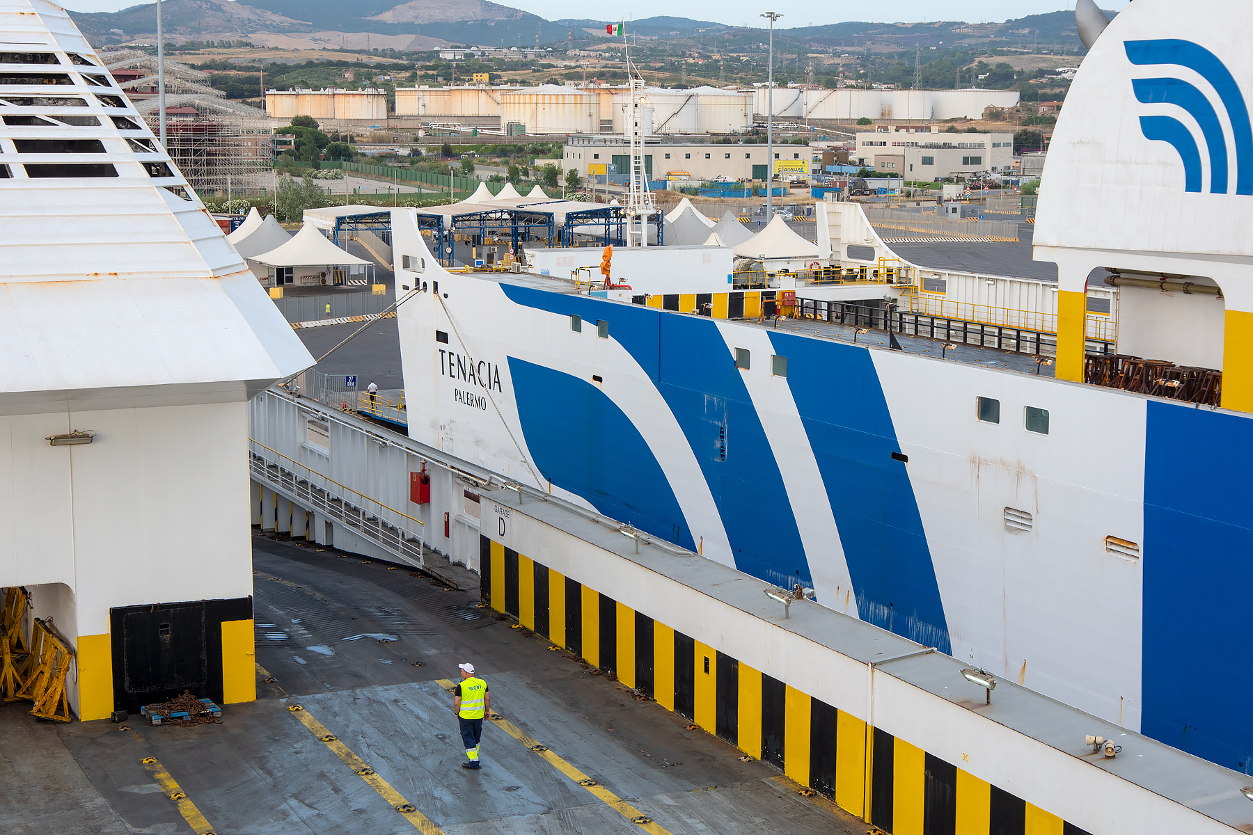 The timetable said we had one hour at Grosseto so Kris and I went for a walk into town while Louise and Damian stayed at the station with the backpacks. It was Sunday when most things are closed in smaller towns, we were also there during sisesta hours which on any day of the week are usually noon until about 5pm. The town was completely dead, nothing at all was open except for an Lidl (like a small Aldi). No cars, no pedestrians, I think we saw two kids on a bike. So the walk was in 36 degrees and a complete waste of time, there wasn't even anything of architechral significance. We got back to the station to discover that due to a "problem with control equipment" all trains were late. In the case of our train it was one hour late. Another beer in the station cafe, and thgen another and finally our train arrived. About an hour and a half later we were at Civavecchia, the port city where would catch ourferry to Palermo (Sicily) We had planned to have a nice sit down dinner before making our way to the ferry but now we didn't have a much time as we thought so we started walking in the 36 degree heat to the GNV port office. We snaked around ancient roman coastal fortifications, past massive yards full of containers and finally got to the embarkment office. He issued us with our boarding pass and told us to get a shuttle bus to gate 28. I told the shuttle bus driver where we were going and he told us to get off the bus at gate 27. And there it was, our ship to Palermo, named "Tenacia". This was the name on our tickets. The only problem was that Tenacia was at berth 27 and we were told to go to berth 28, right next door, must be a simple mistake we though but no, despite questioning the officials several times we were told our ferry was on berth 28. We got on board and I asked the pursor "are we on the correct ship?" si si, yes, yes, he replied. Curiously our tickets did not say that Palermo was our destination but a place called Termini Imerese. But oh well, we had been assured were were on the right boat. What was disnconcerting was that the boat whose name appeared on our tickets was right next to us! BELOW: