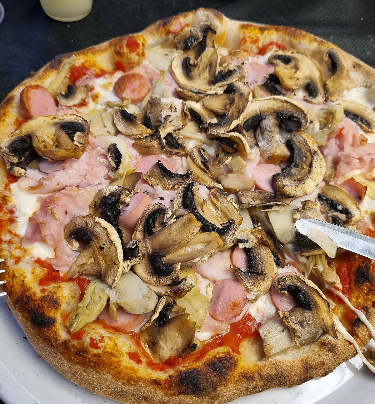 After our drinks we went back to Kris's favourite restaurant in the whole world, La Brace. Kris had a Capricciosa pizza BELOW