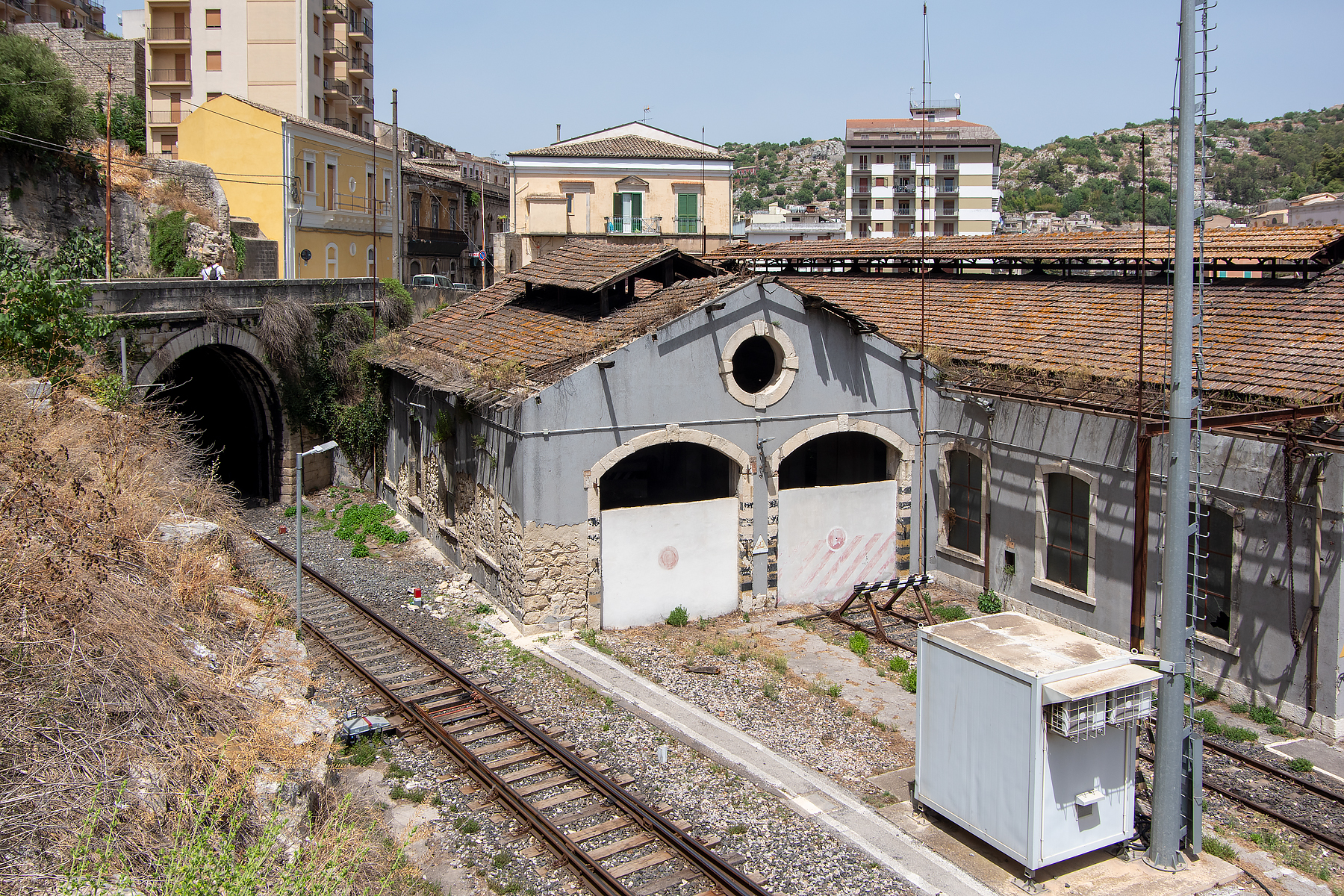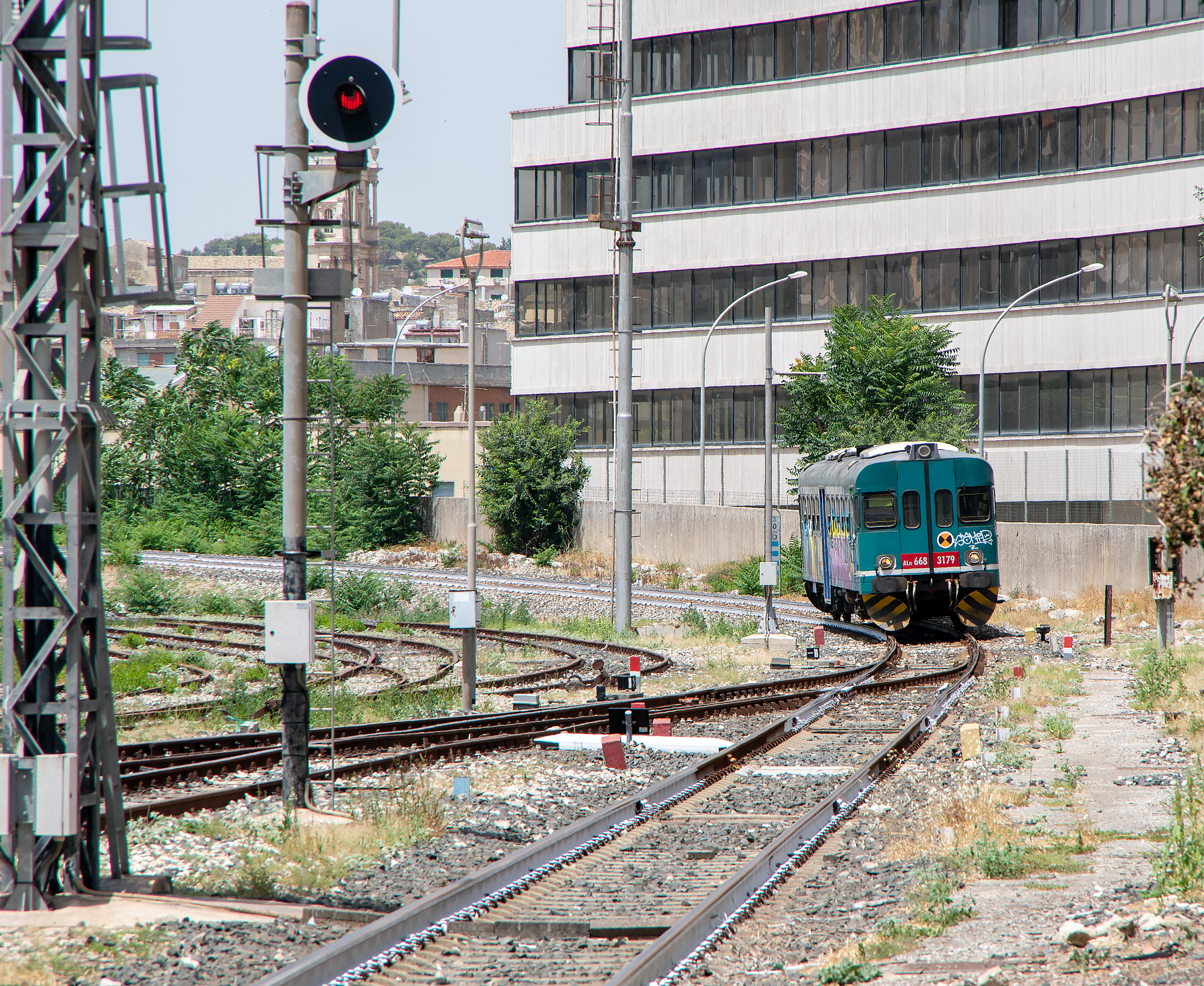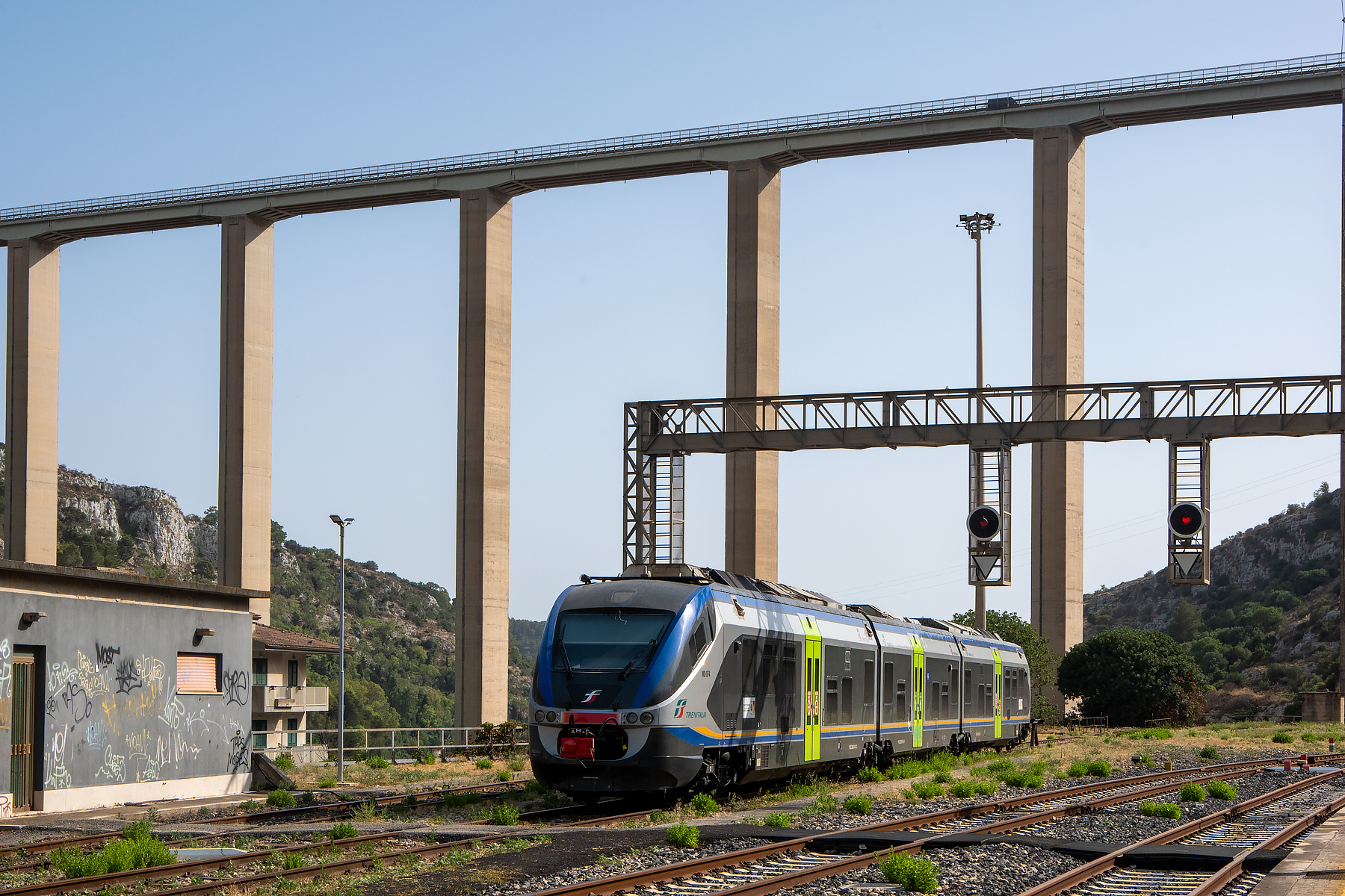 ABOVE: We walked back to the station at Modica and waited for our train back to Ragusa, this train was stabled in the yard near the impressive freeway bridge.