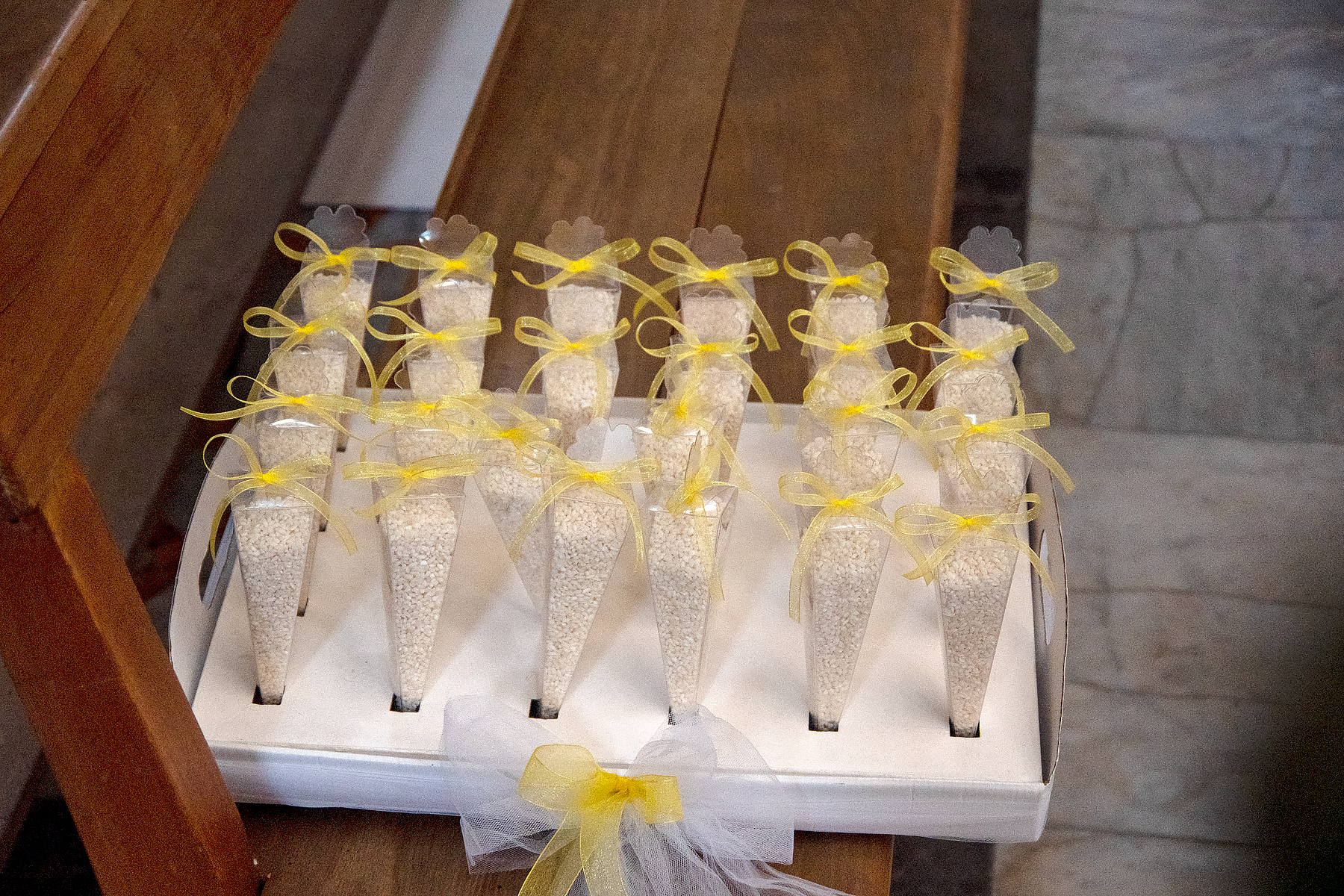 ABOVE: The little packets of rice for guests to throw on the newlyweds, laying a a pew.