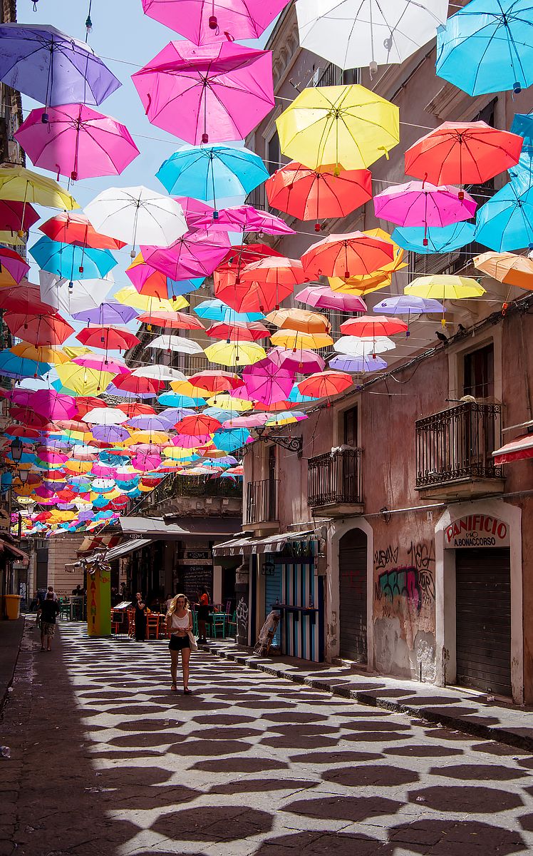 ABOVE & BELOW: The main fish market and eating areas are defined by 100s of umberallas hanging above.