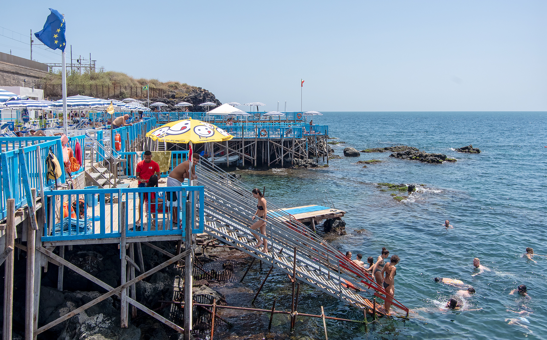 BELOW: It didn't have a beach but it had steps into the water to go swimming. The lifeguard is in the red shirt, the whole time we were there he was looking at his mobile phone!