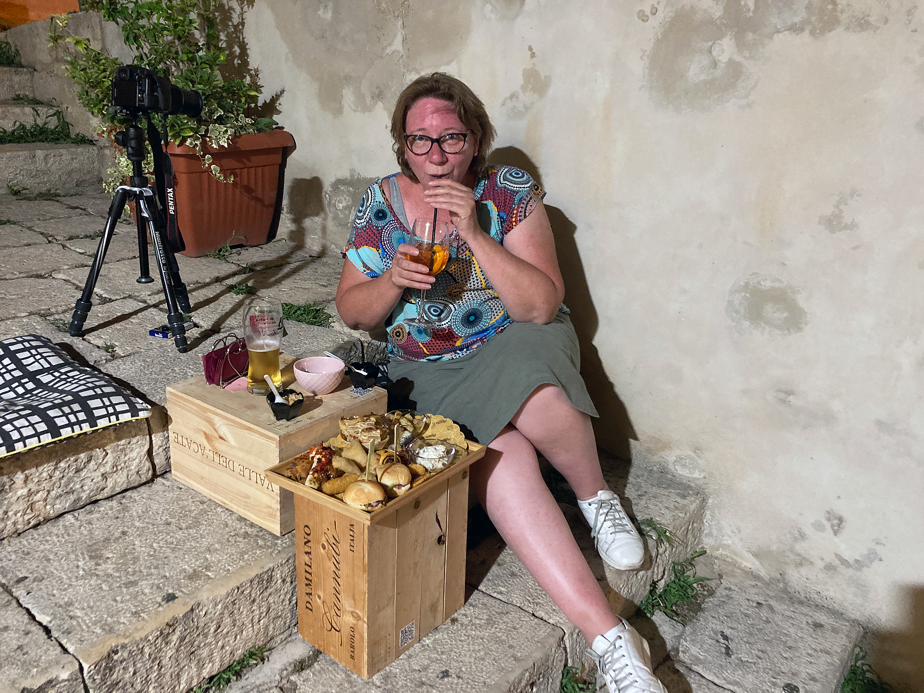 ABOVE: Here is Kris with our drinks, cushions, table/boxes and apertivs on the stairs.
