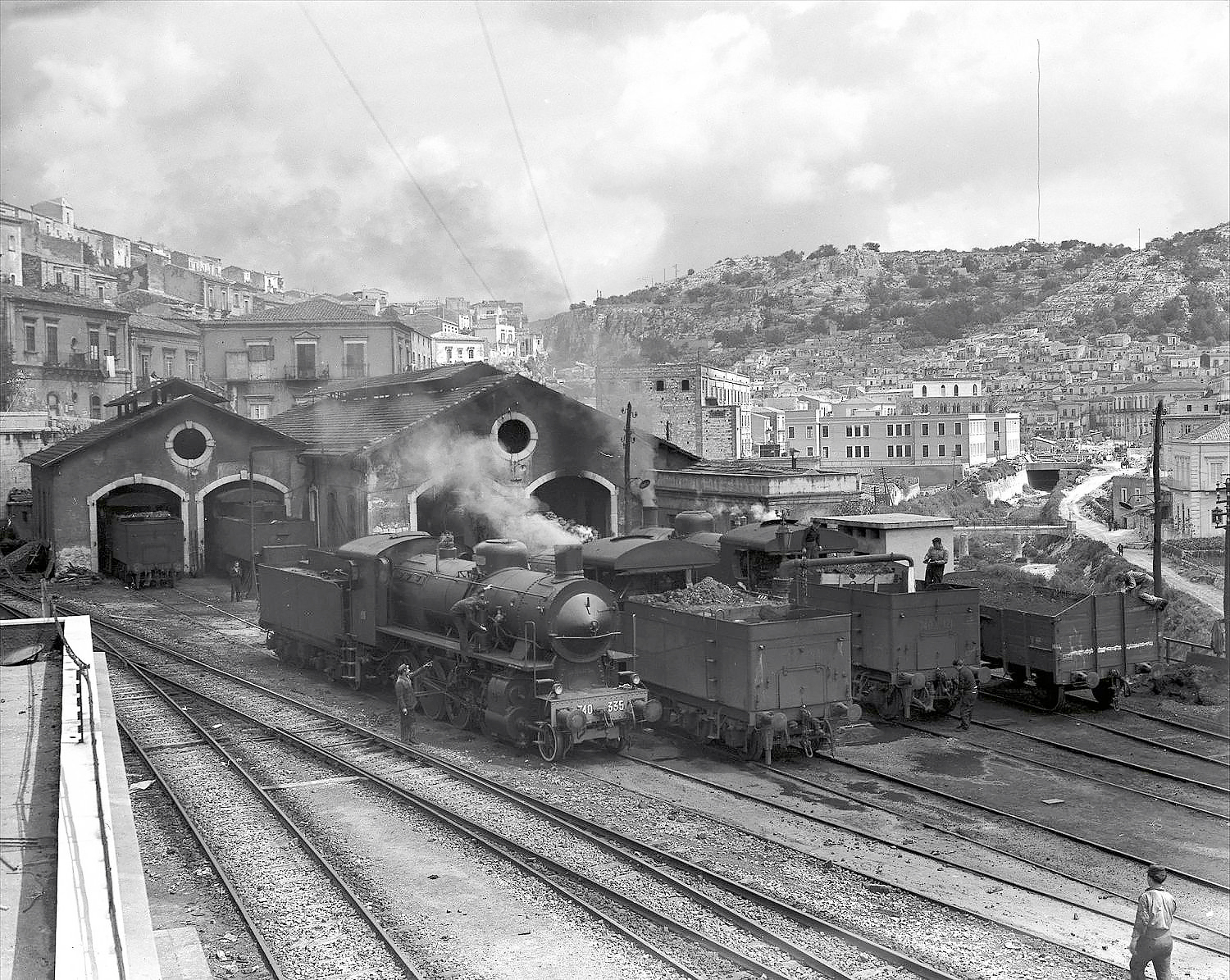 ABOVE: The tunnel on the left is how trains from Ragusa enter Modica, the old steam loco sheds are on the right, BELOW is a photo of the sheds in action in 1955 from the Italian rail Historical collection.