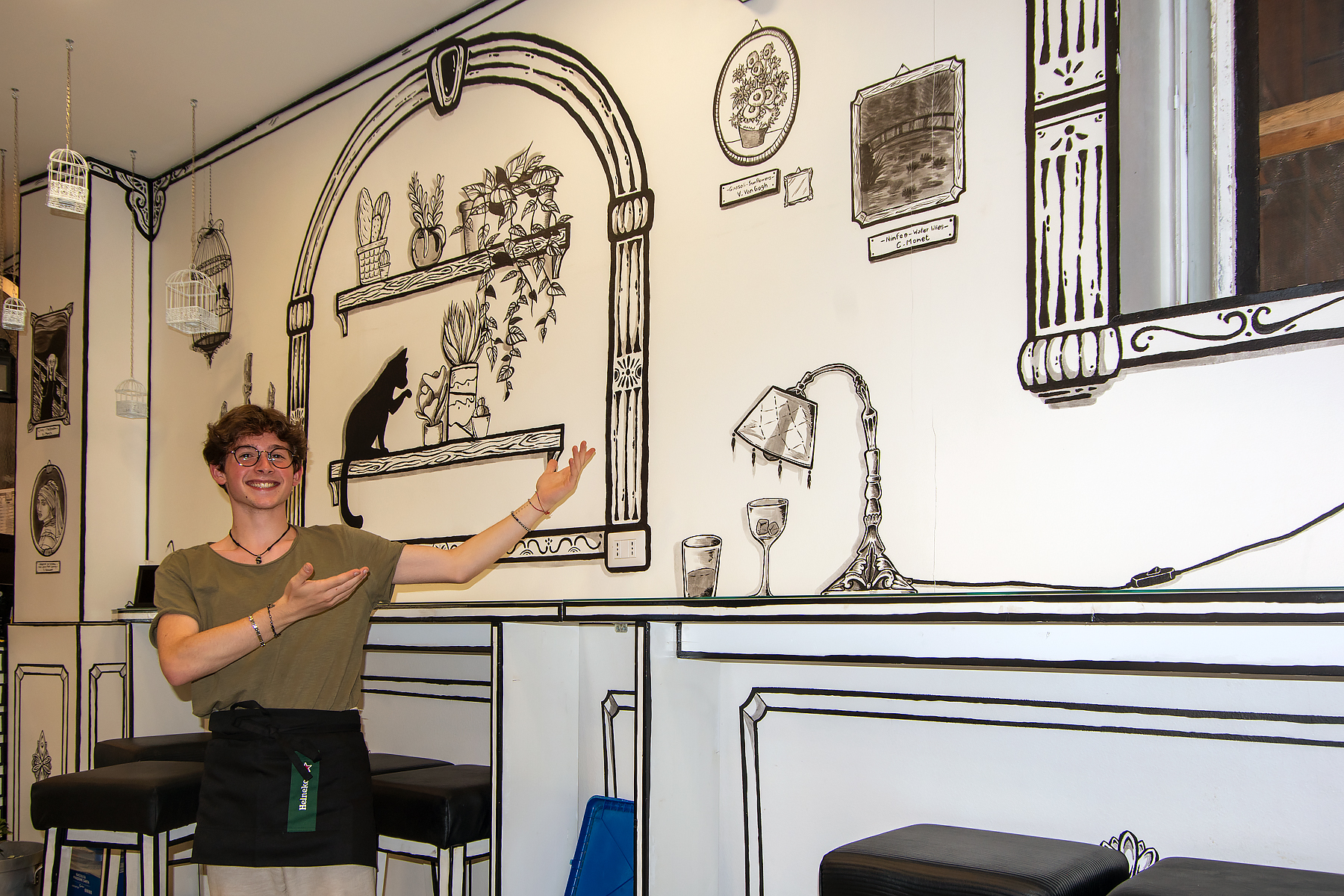 I went off on my own for dinner as the restaurant we picked didn't suit me. I went to a little fast food place that looked across the moutains and ordered a beer and panini. I then discovered that their card machine wasn't working. The owner spoke no English and with my tiny bit of Italian deduced that he was saying that it was his fault the card machine wasn't working and I could have the Panini free, I asked where an ATM was and he gave me vague directions. I got a bit lost and couldn't find my way back. I got some cash out of an ATM and then found another Italian fast food place and ordered a arancini, which was brilliant, and a slice of pizza which was ok. The bloke working there was in high school and is learning English so he wanted to talk with me. He told me that he had painted the murals in the cafe BELOW: We talked about art and famous painters. His name was Thomas and he was a really nice bloke. He told me a friend had shown him Australian football and he asked how many people must die playing it each year because he thought it was so rough. The people of Sicily are so nice.