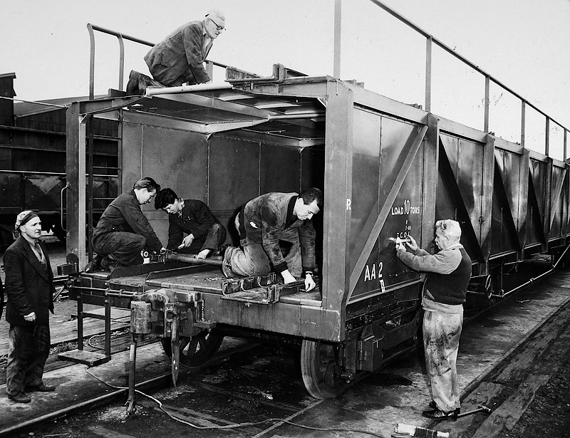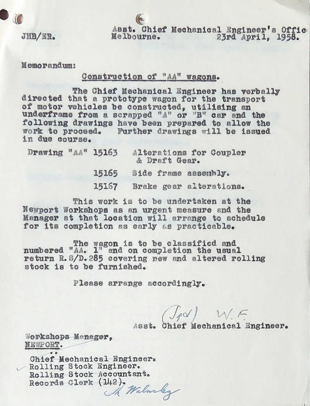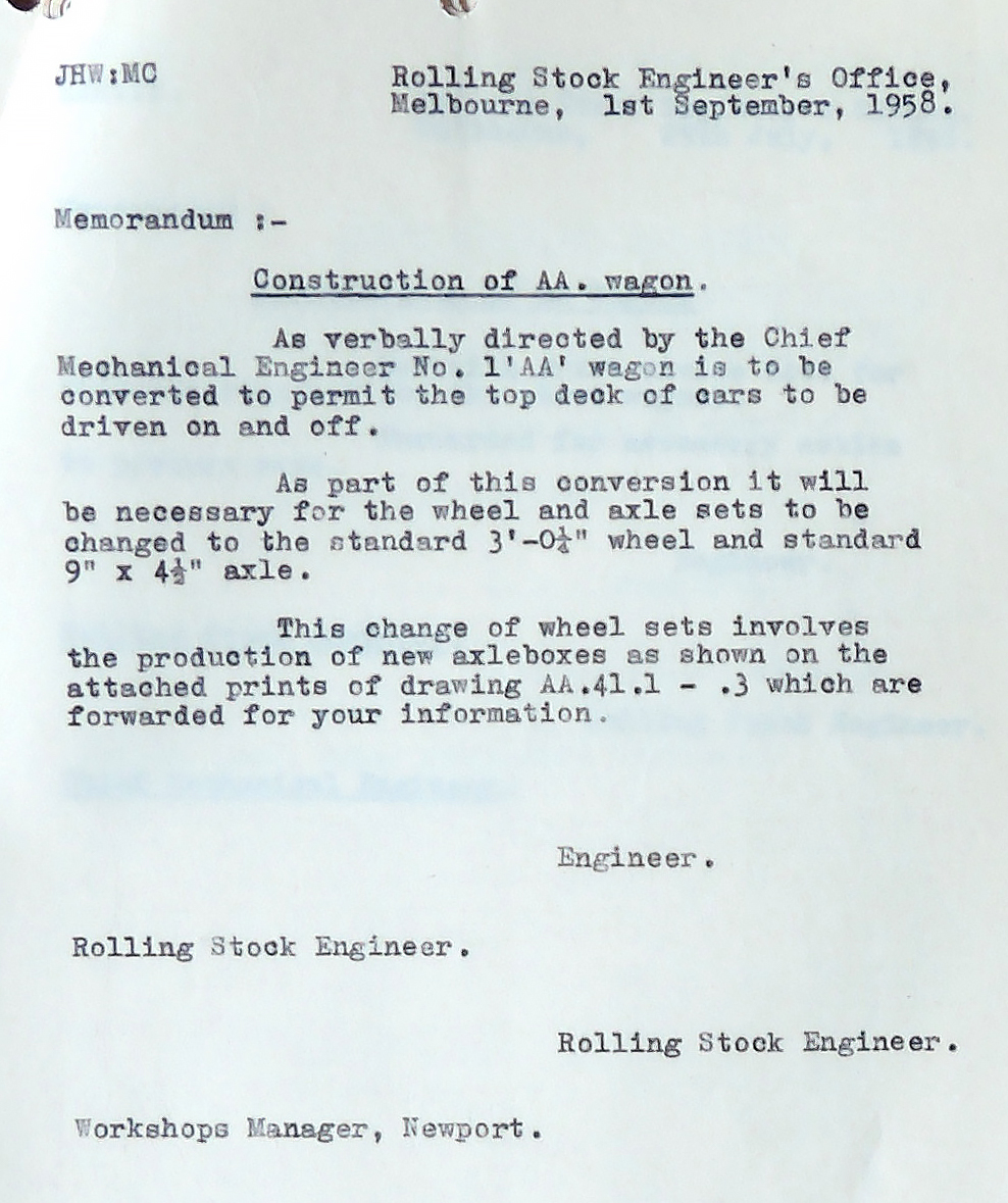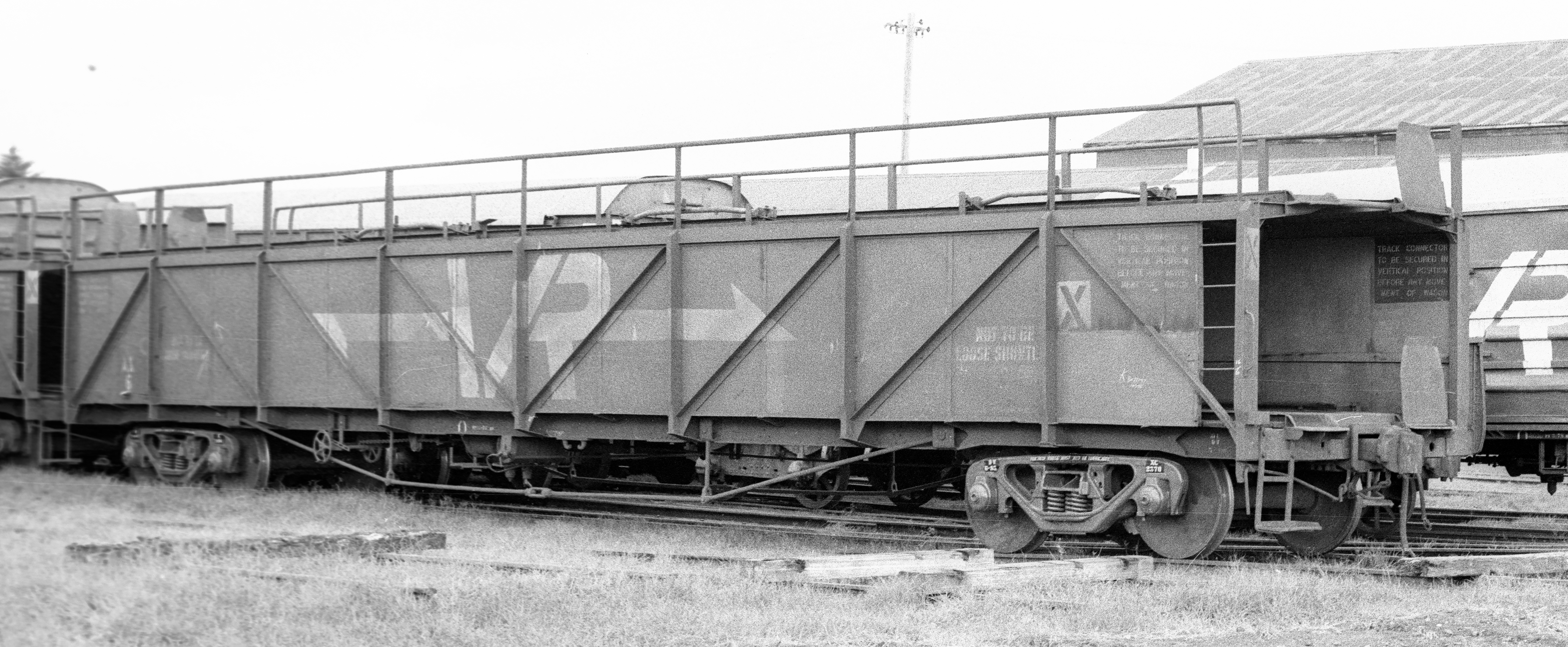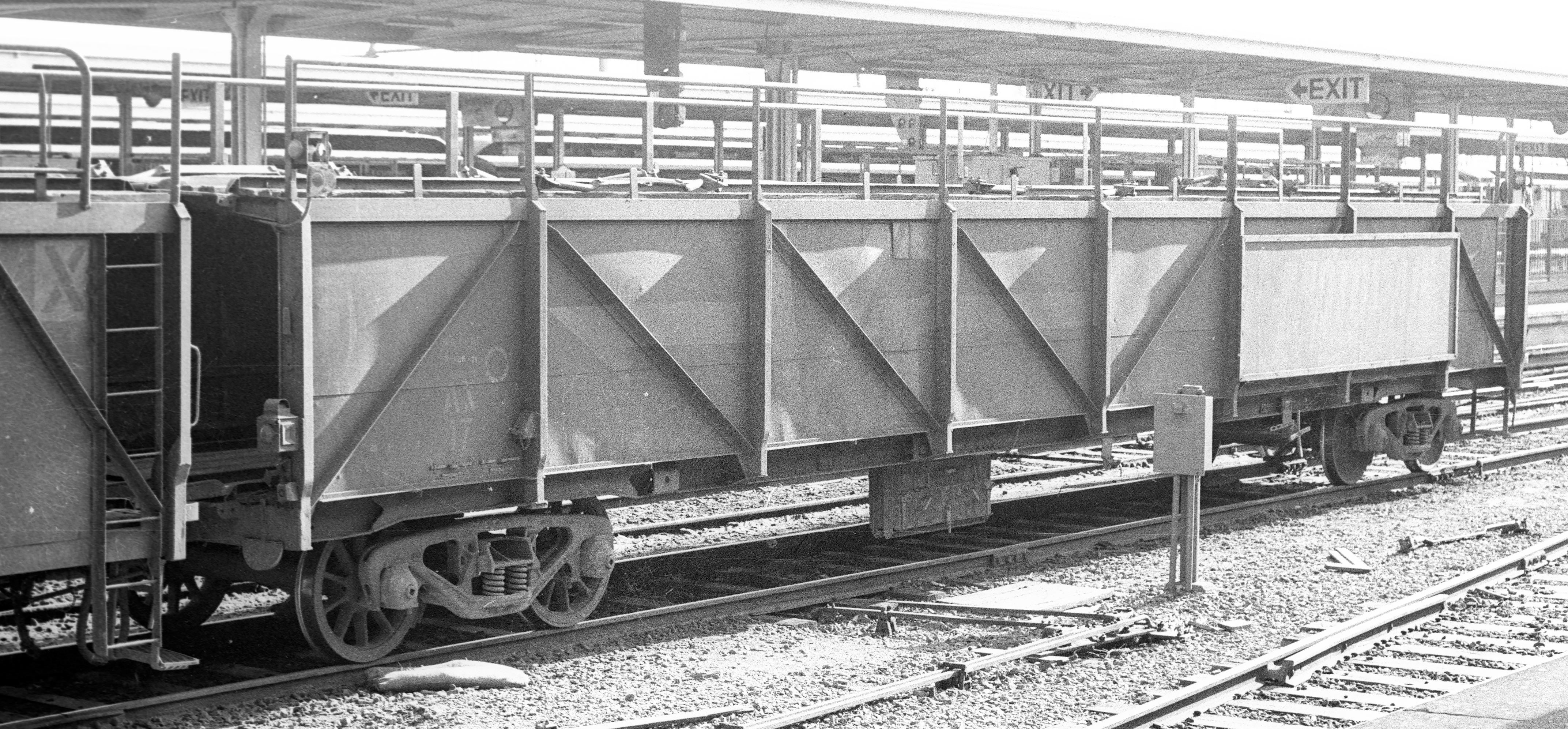 In the late 60s - early 70s the entire class was fitted with new underframes. (Correspondence exists regarding the AX wagons that relates to rebuilding of underframes at Ballarat Workshops 1969-70 that includes AX 22 (13/11/1970) and AX 15 (22/7/1970) both stating: Owing to poor condition of AX. it has been decided to rebuild the underframes at Ballarat Workshops in accordance with drawings AX 10835 and .1 - .13 and 108537.1 - .2. The Workshops Manager, Ballarat is to arrange for the manufacture of the centre sill and outriggers, fabricated front and back stops and the re-assembly with the existing body. Earlier correspondence identifies that the light weight underframes were under duress when at the front of 40 vehicle trains to South Australia.