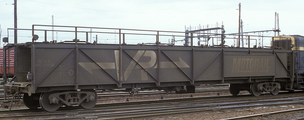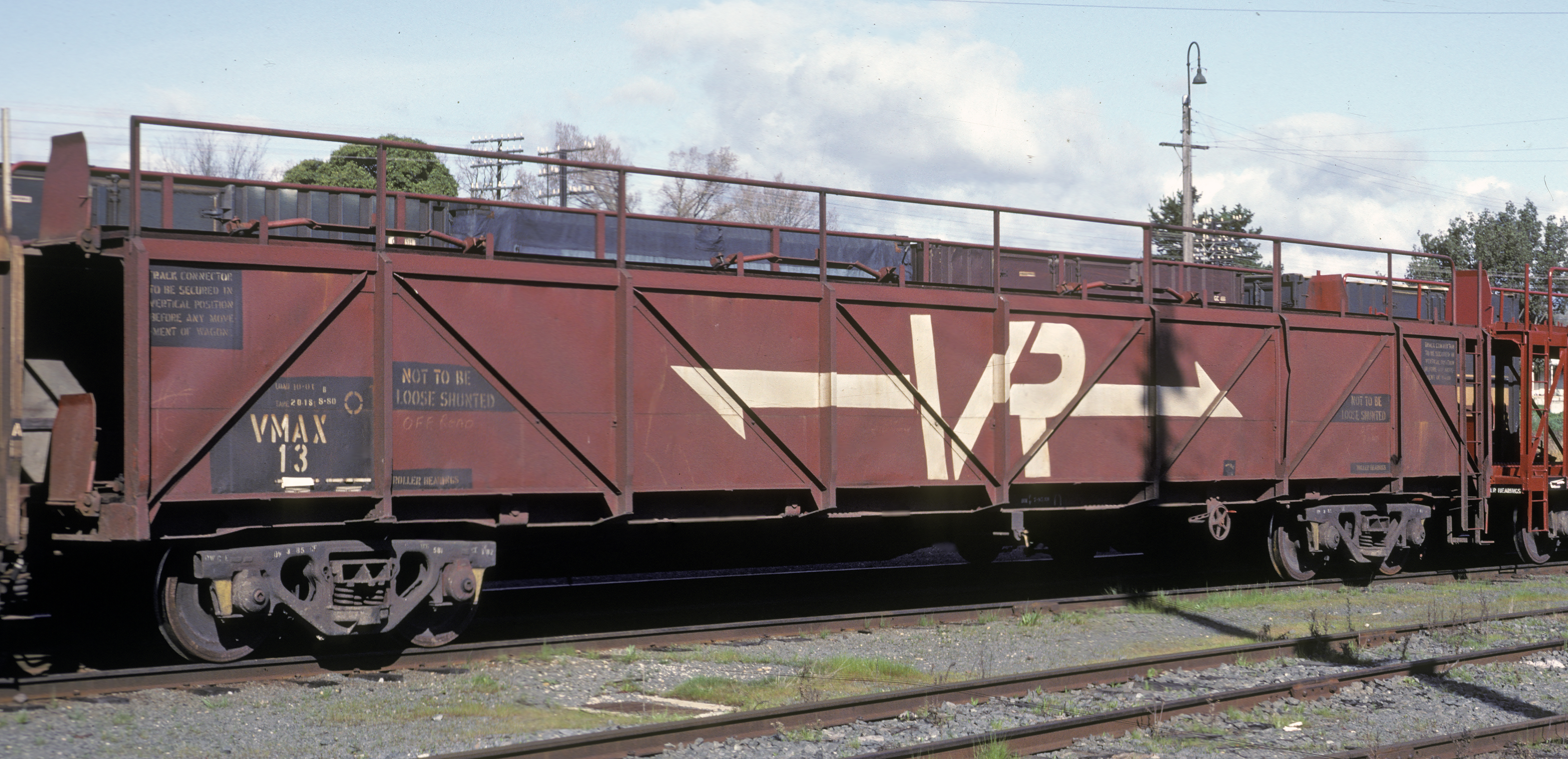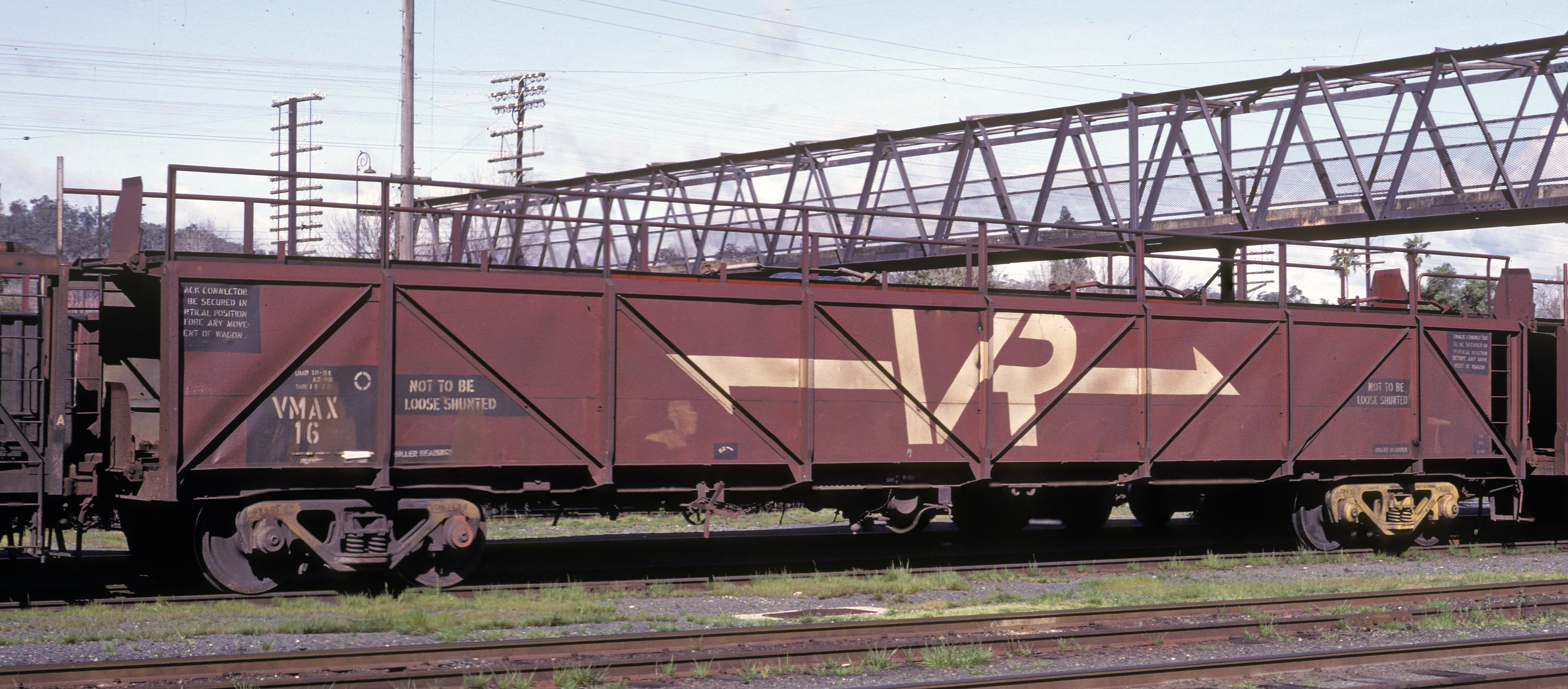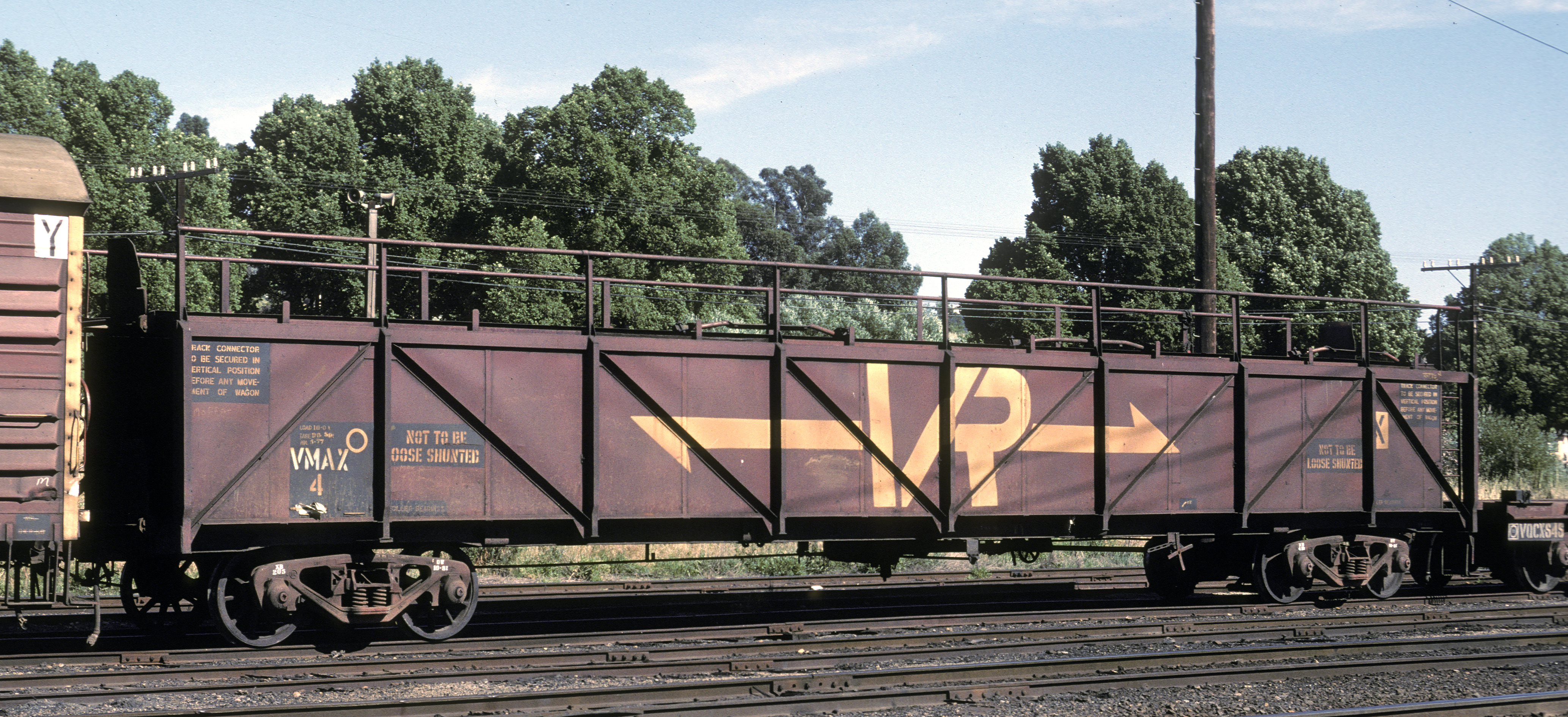 ABOVE: VMAP 10 in the garish V/Line tangerine scheme at Mildura. In later years the ones in MotoRail traffic got aligned bogies as seen here, the MotoRail ones also went through a few re-codings (AX - VMAX - VMAY - VMPY - VMAP) Aug 17 1985. photo courtesy Bruce McLean
