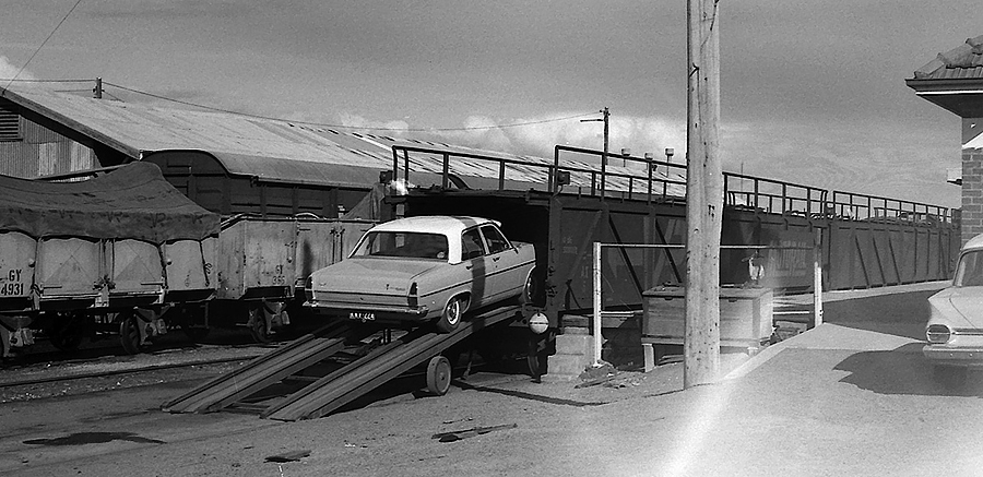ABOVE: Prior to the introduction of MotoRail on the Vinelander we see AX 8 being loaded with a car as a test at Mildura. Aug 6 1968. official VR photo courtesy Bruce McLean