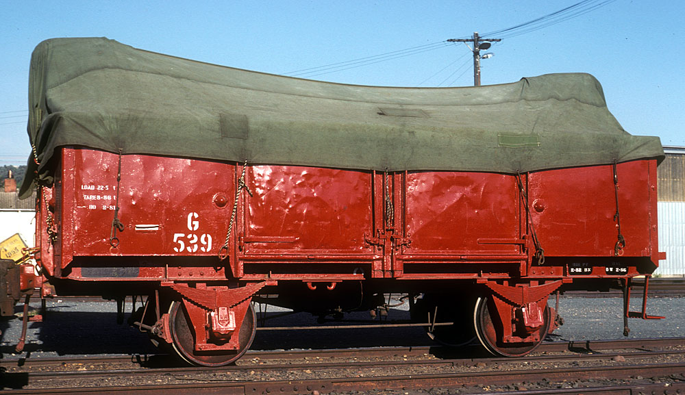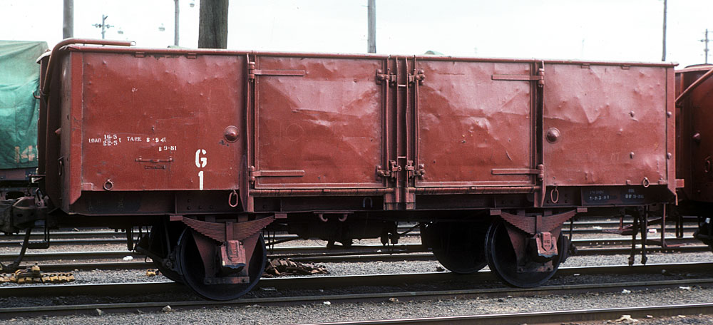 As more bogie wheat hoppers were built the number of GY's was reduced by recoding some to G for general (non bulk grain) traffic, the original GY number was retained. The use of the letter G could be considered a mistake as the letter G had formerly been used to denote a bulk grain wagon (GZ, GY, GJF etc) At first the wagon was simply painted with a brown diagonal stripe (as shown above) but as the wagons were shopped they were painted in the usual VR wagon red (as shown below) | |||||||||||||||