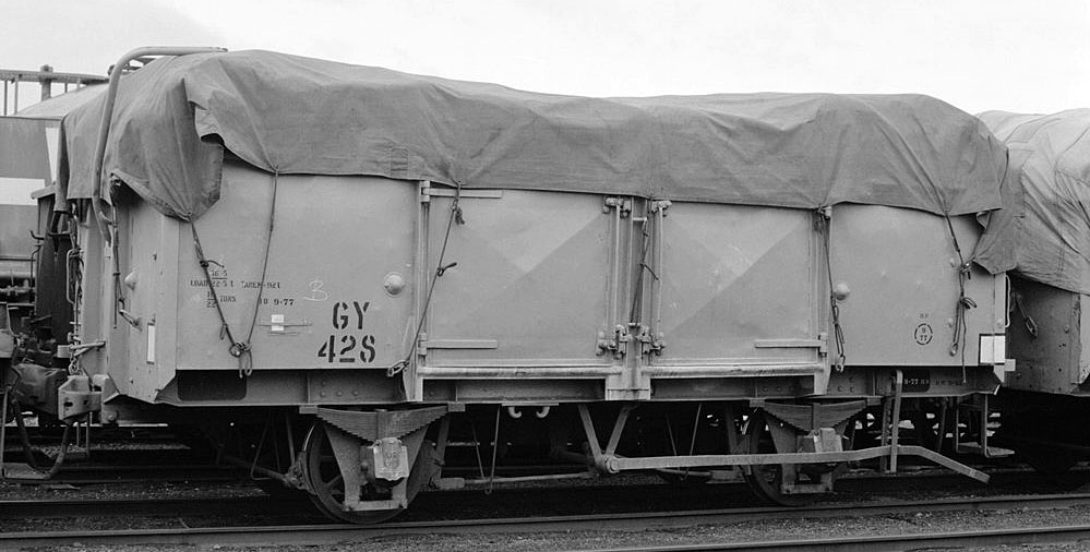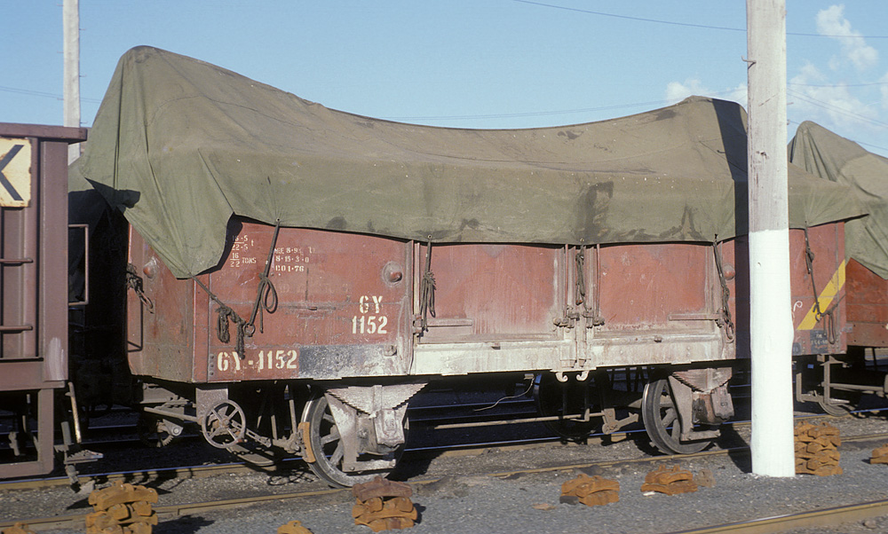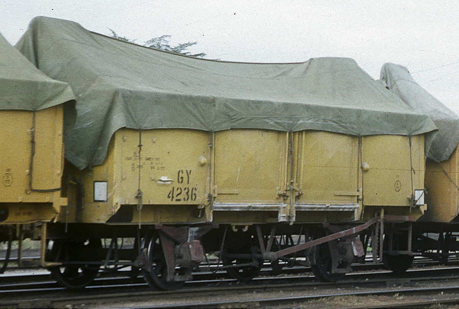 : When loaded with wheat, the tarps on GY's were quite consistant, but with other loads the tarping could get a little creative like we see here on GY 428. Note the handbrake in the applied position. 1978. (photo courtesy Peter J Vincent)