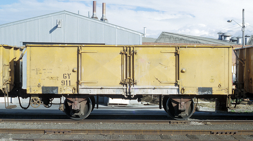 ABOVE: GY 911 photographed in 1978. GY's 911 - 1160 (except 1080) were converted from IZ class wagons, their outside sill made them the only major variation within the GY class. All GY's in this number group had wheel handbrakes.
