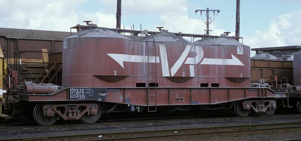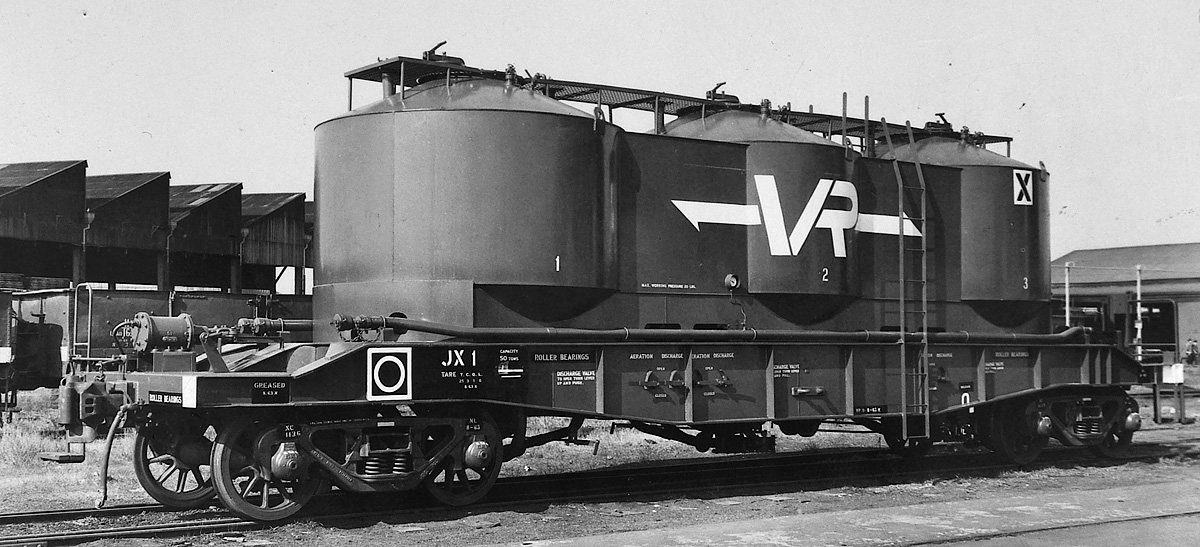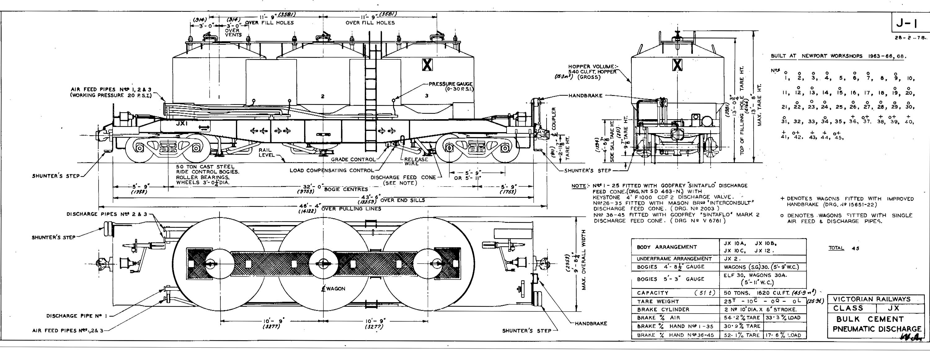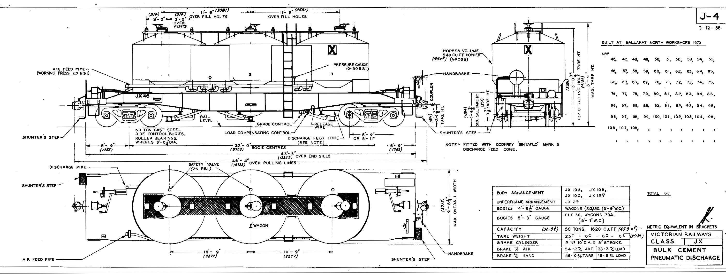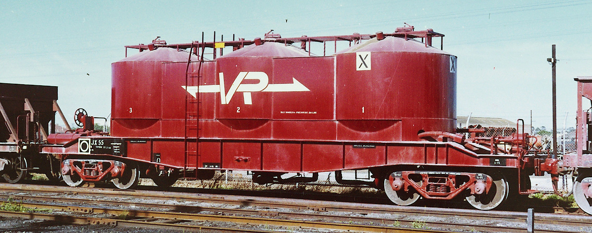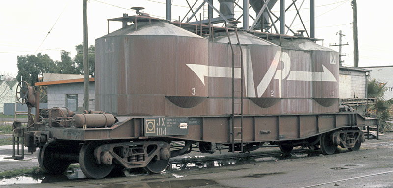 The JX's carried bulk cement, mainly from Waurn Ponds near Geelong, to many locations around the state. An air supply was required to unload them as they were not gravity discharge. In the mid 80's they were used to carry cement to NSW for the building on the new parliament house in Canberra, in this service they ran in blocks of about 15 - 30 wagons.