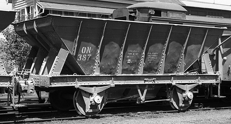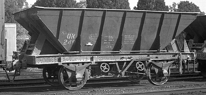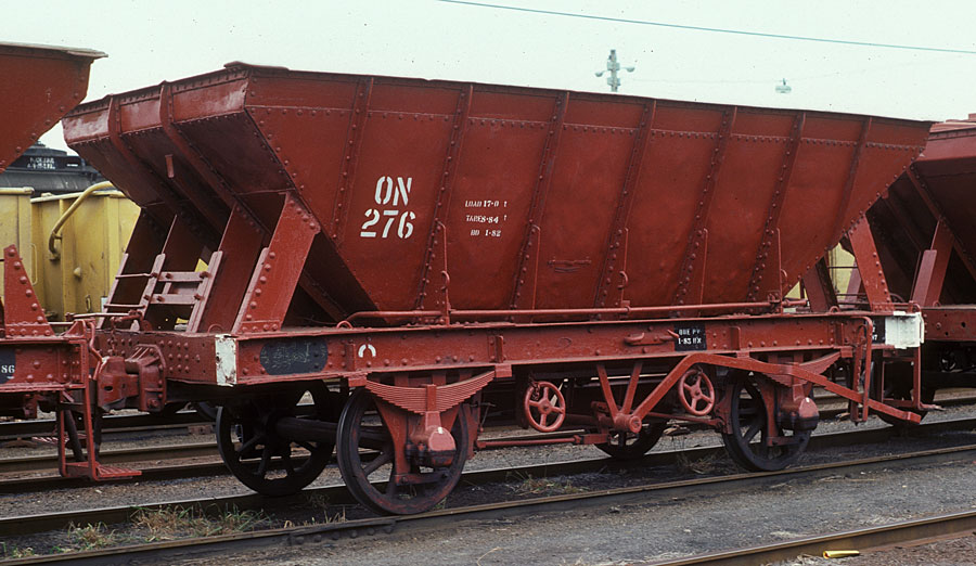 Converted from O wagons (1959 - 1961) the ON class were used in ballast service. Many ON's were stencilled for SEC traffic between Maryvale and Morwell where they carried briquettes to the Maryvale timber plant. | |||||||||||||||||