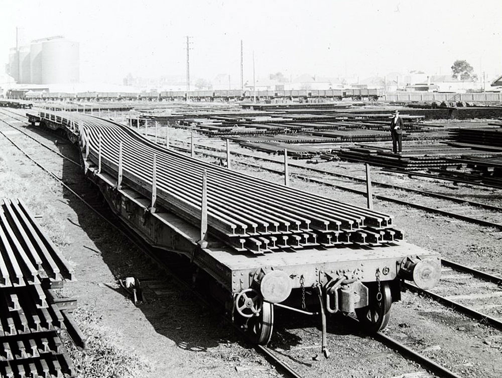 ABOVE: A rake of Q's loaded with welded rail at Spotswood, note early position of handbrake.