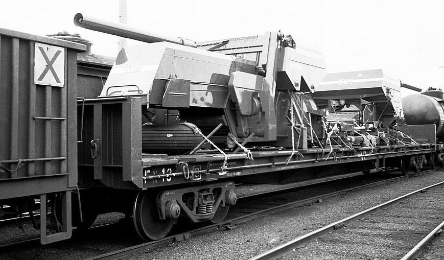 SFX 13 loaded with combine harvesters, Tottenham yard, July 1979.