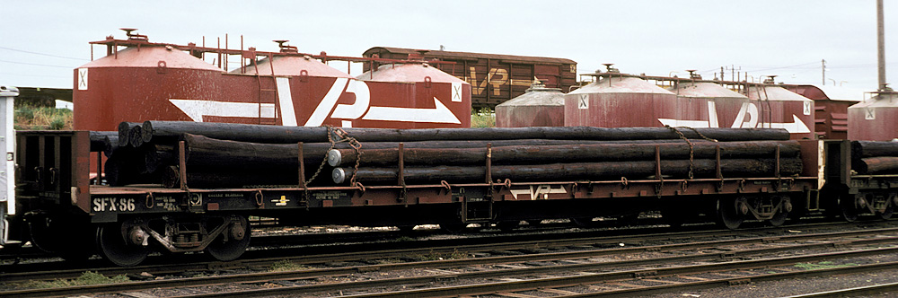 A very versatile wagon, they were used in all sorts of traffic as well they could be pushed into container service. SFX 100 was heavily modified as a test for what became the VFNX class. In 1977 numbers 105, 106, 108, 79, 80, 81, 96, 114, and 119 were recoded to SFF and numbered 1 - 9 respectively for dedicated intrastate container traffic. |