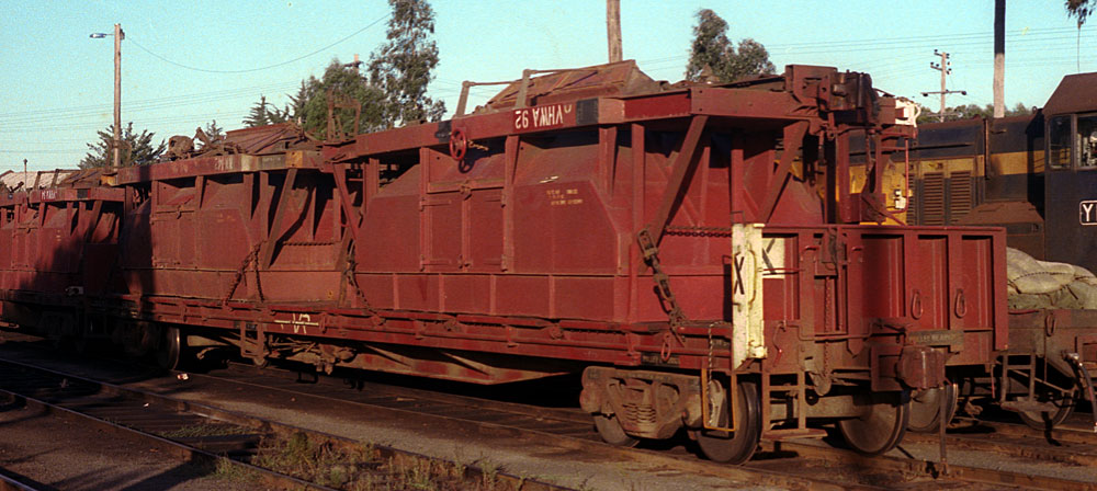 Unknown SFX at Bendigo loaded with derailed VHWA's, 1980
