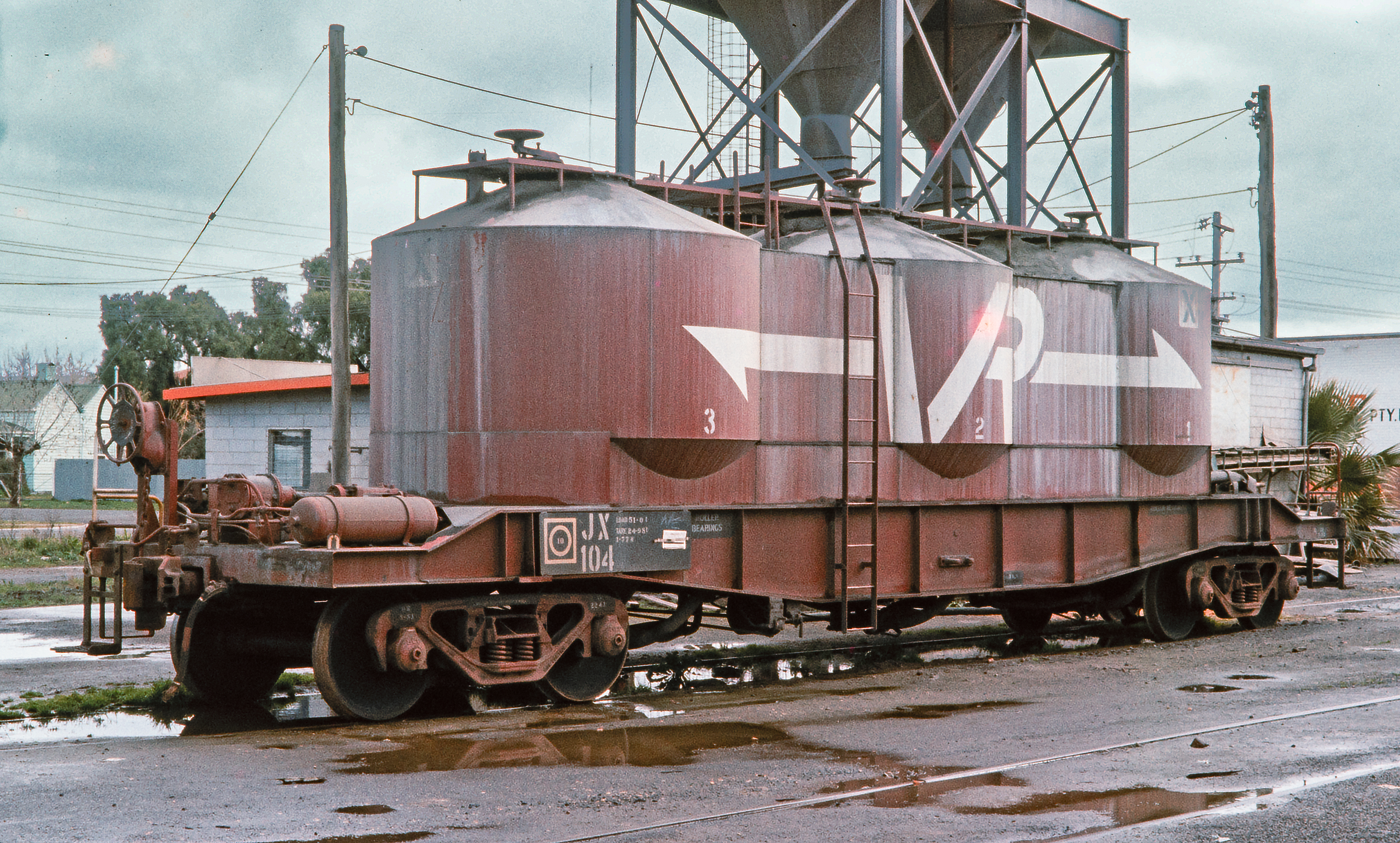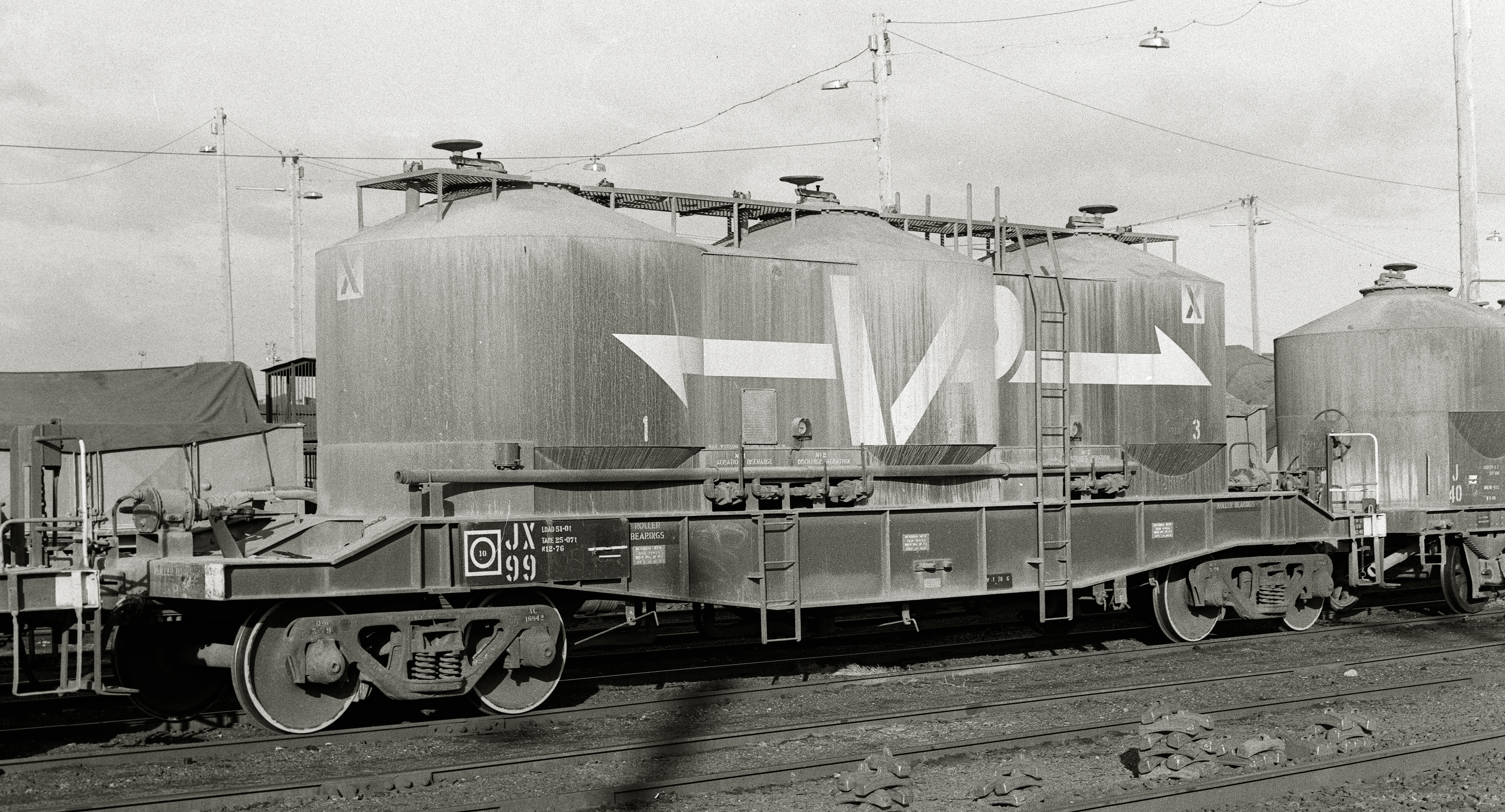 The JX's were built in 5 groups between 1963 and 1982, eventually numbering 158 wagons in the class. Theycarried bulk cement, mainly from Waurn Ponds near Geelong, to many locations around the state. An air supply was required to unload them as they were not gravity discharge. The method of discharge was the same as "Airslide" technology used in the US. In the mid 80's they were used to carry cement to NSW for the building on the new parliament house in Canberra, in this service they ran in blocks of about 15 - 30 wagons. In the 1979 recoding they became VPCX.