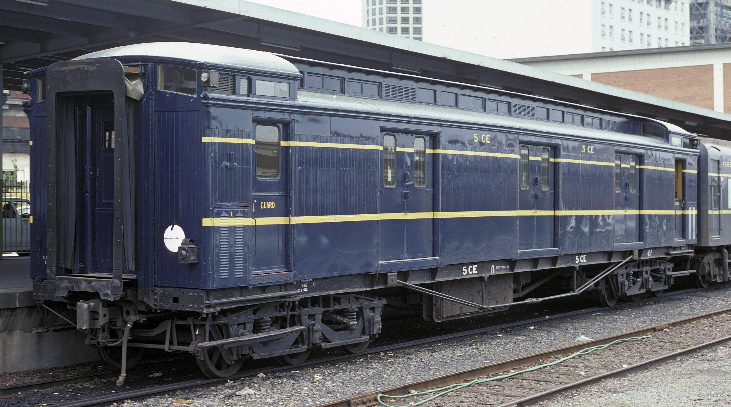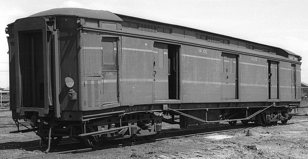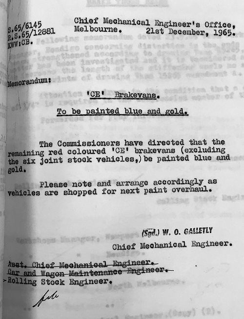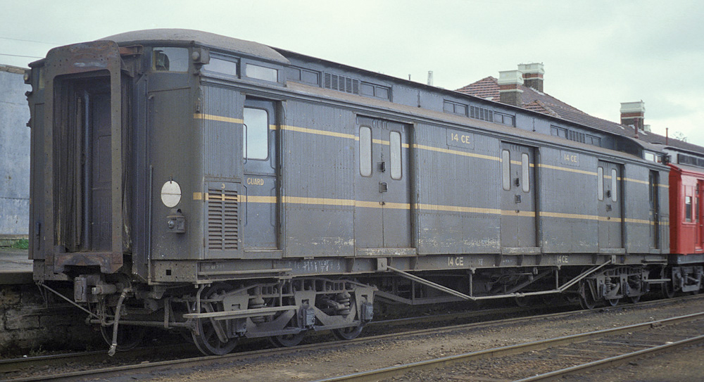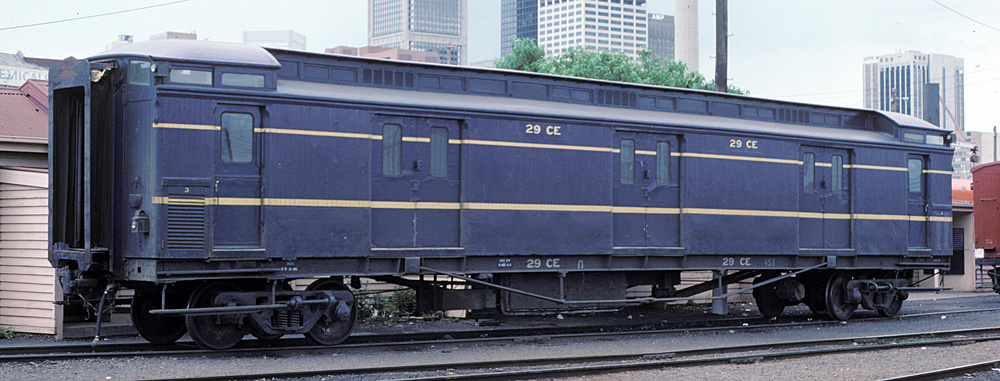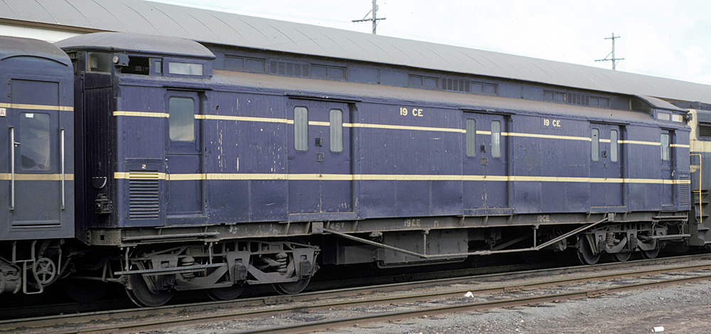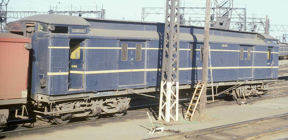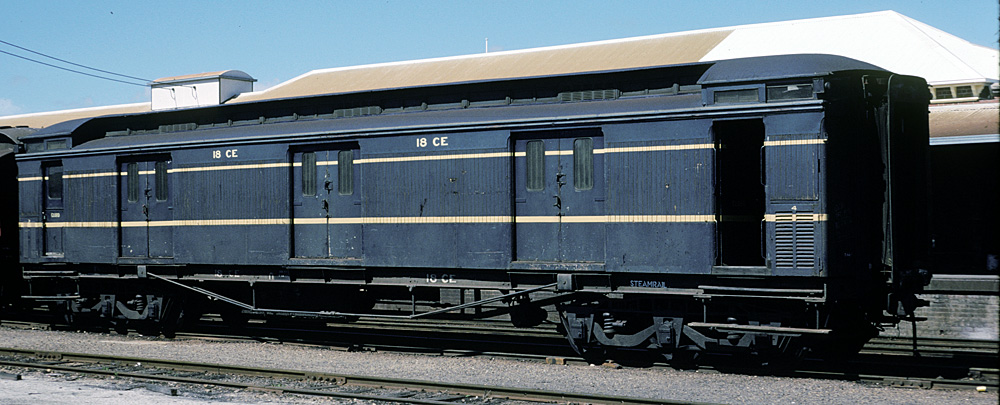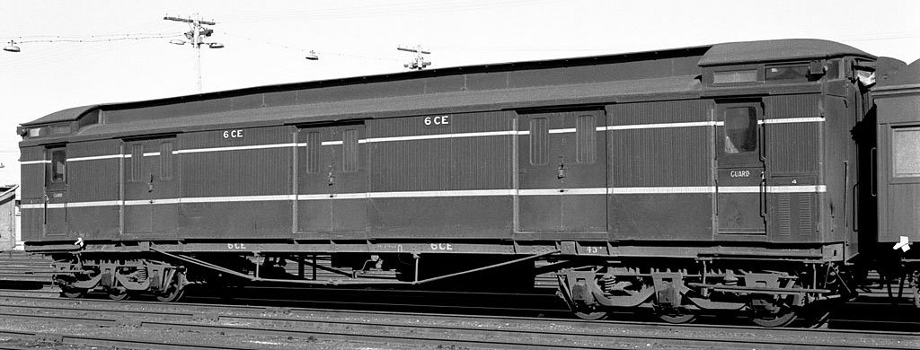 | These guards vans were introduced at the same time as the AE and BE passenger cars and were a mainstay on VR passenger trains for the whole of their long lives. In later years most had sheetmetal covering the wooden sides below the bottom yellow band to prevent damage from parcels/luggage trolleys. They started being painted blue in 1954 for the Royal visit, (CE 34 was painted for the Royal train), by Nov 1957, CE's 17, 34, 35 and 36 had been painted blue, all were done by the early to mid 1960's.