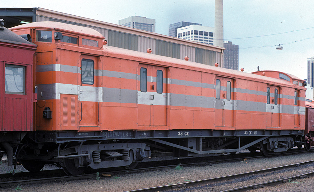 ABOVE: CE 33, photo date: Jan. 1983 It is doubtful that any piece of rollingstock ever looked worse in the VicRail tangerine scheme than this! (photo courtesy Rob O'Regan)