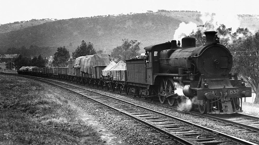 ABOVE: A1 832 on a down goods at Kilmore East prior to auto couplers, electric headlight and modified front end circa mid 1930's. The A1 classification was used to denote A2s that had not been superheated. Between 1923 and 1949 remaining non superheated Stephenson locos were reclassified/renumbered as A1 class. Upon superheating these locos were reclassified/renumbered as A2's (J. L. Buckland collection, courtesy National Library of Australia.)