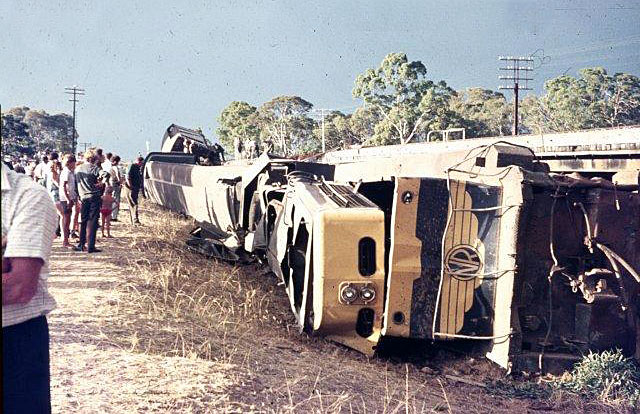ABOVE: X 35 lies in the floodplain of the Wimmera river near Glenorchy after hitting a gravel truck whilst running the afternoon Dimboola to Spencer Street pass. 1971