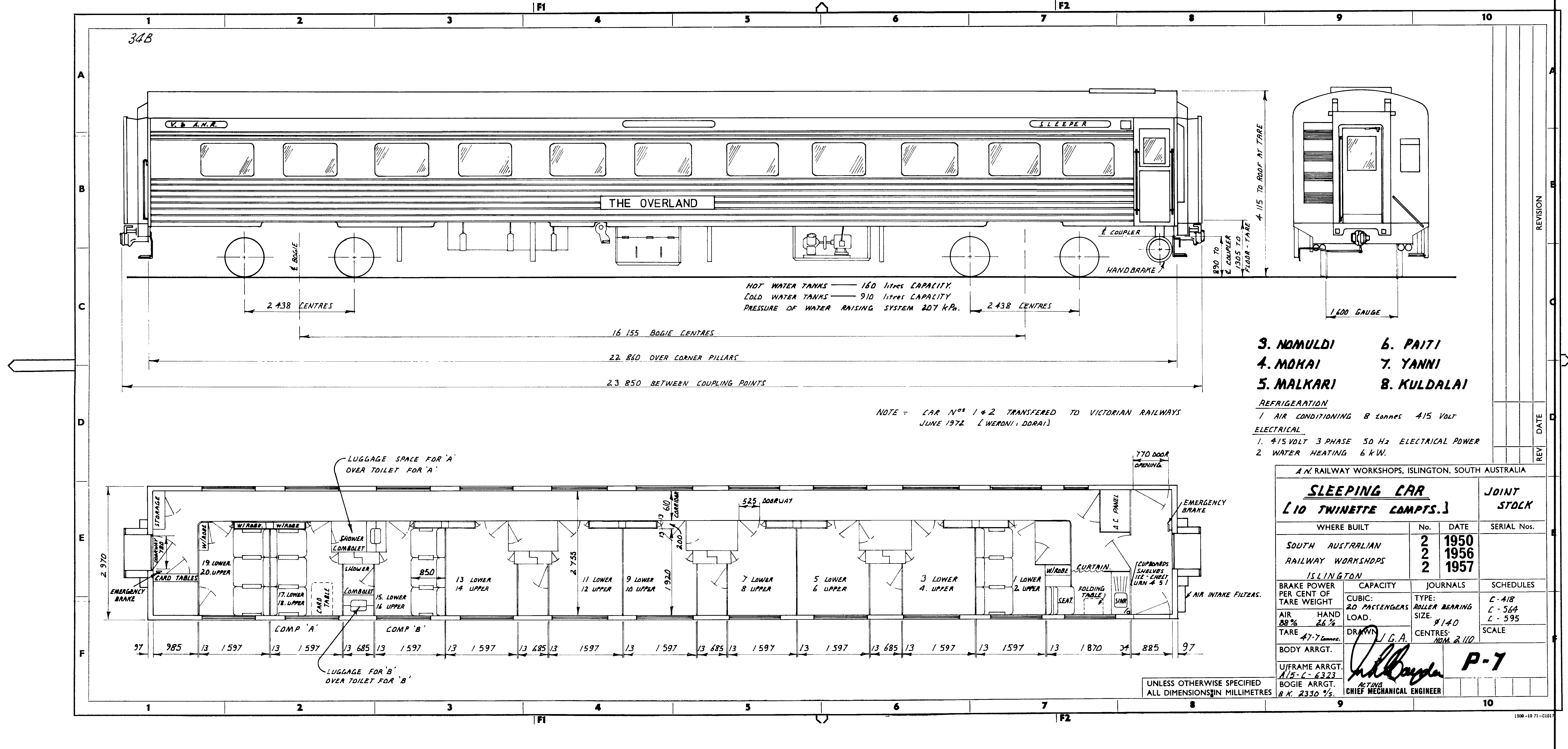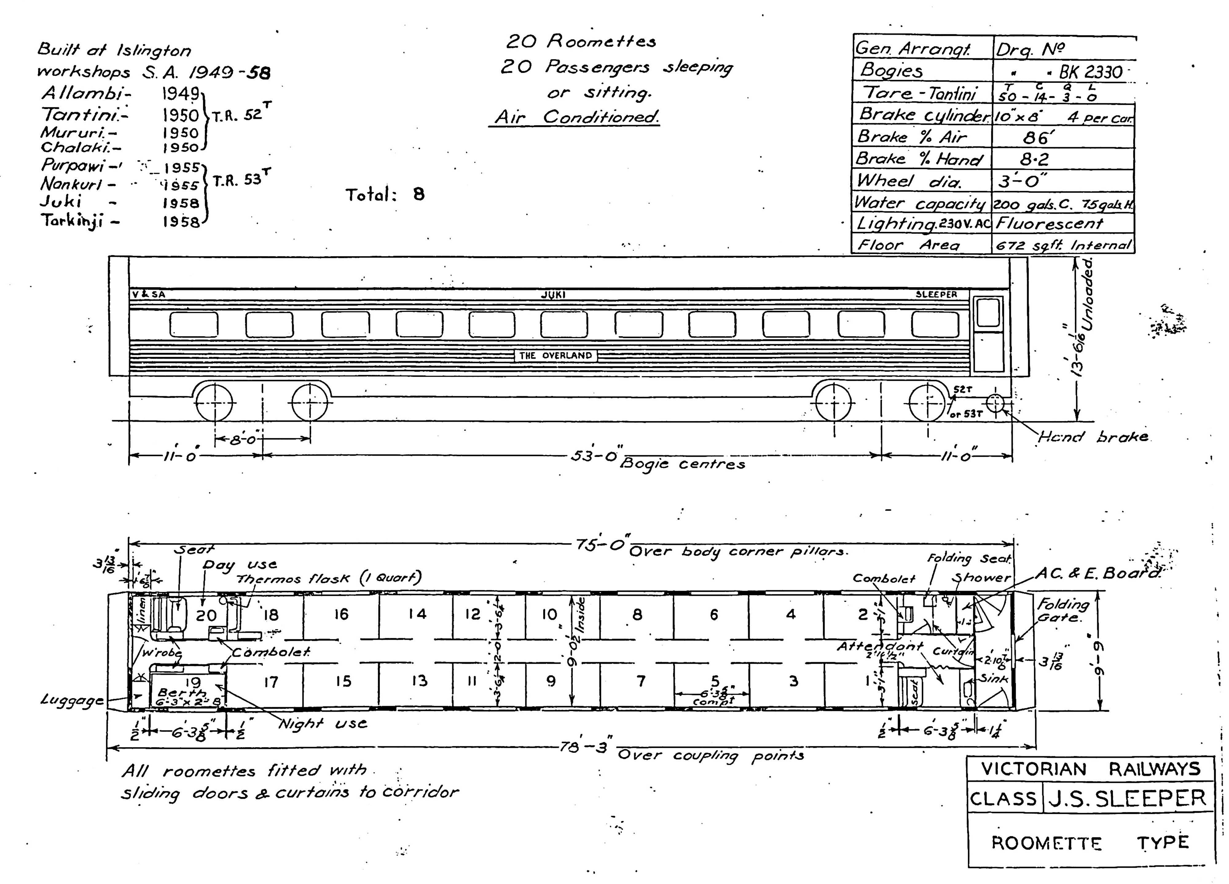 ABOVE: This was the first ALLAMBI placed in service Dec 1949. Note the skirting at the bottom of the cars and the older style Overland logo. ALLAMBI and TANTINI were sold to the VR in 1972 and became Sleepers 11 & 12 for use on The Vineleander. Replacements were built in 1972 re-using the same name as the cars they replaced. (photo courtesy The Overland Museum collection) BELOW: the plan for the replacement cars.