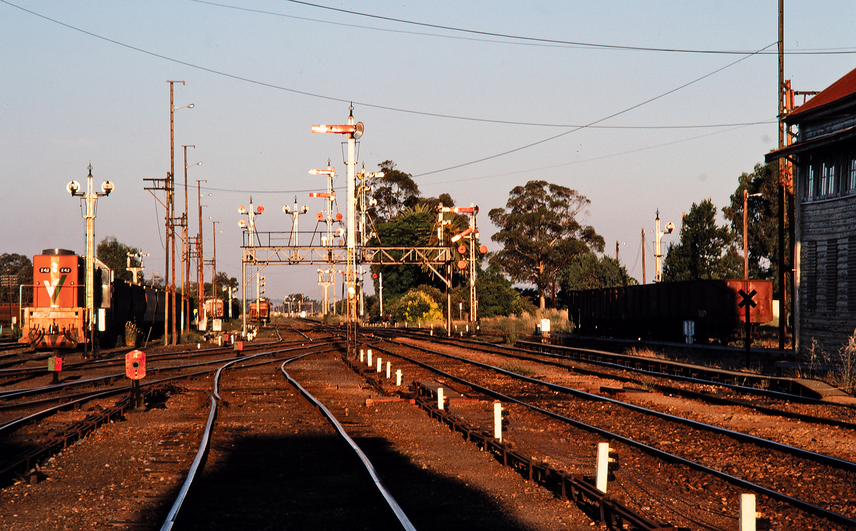 ABOVE: The down home arrivals, Benalla A box is on the right. BELOW: Similar view a bit closer to the signal box. 1987. photos courtesy Noel Bamford.