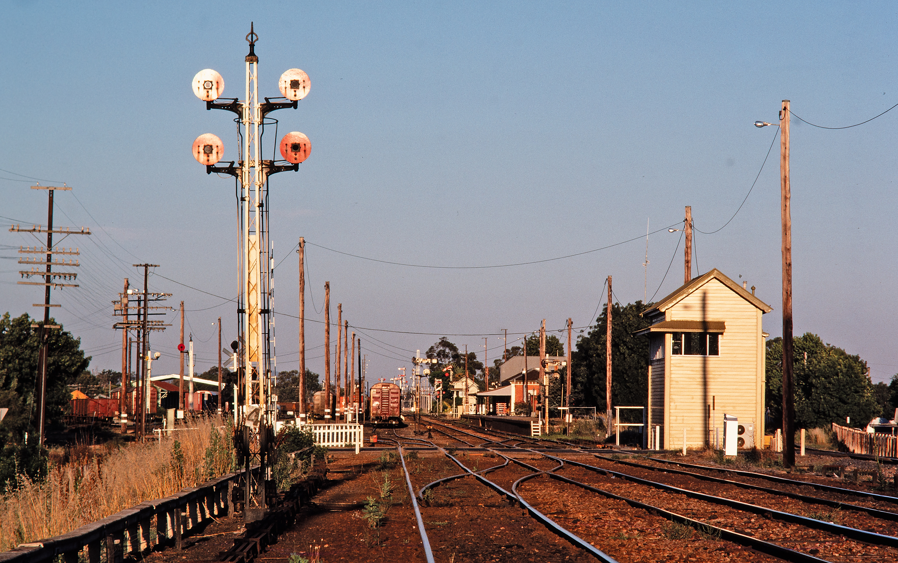 ABOVE: The impressive signal bridge at the down end of Benalla. Like most stations on the North East, the platform was on the diverging road. Trains going straight through went on No.2 road. The home signal on post 26 would be the signal the up BG Spirit of Progress got to fly through. The signalbox under the signal bridge was Benalla B, the signal box to the right was Benalla A, June 1980. (photo courtesy Dave Harvey)